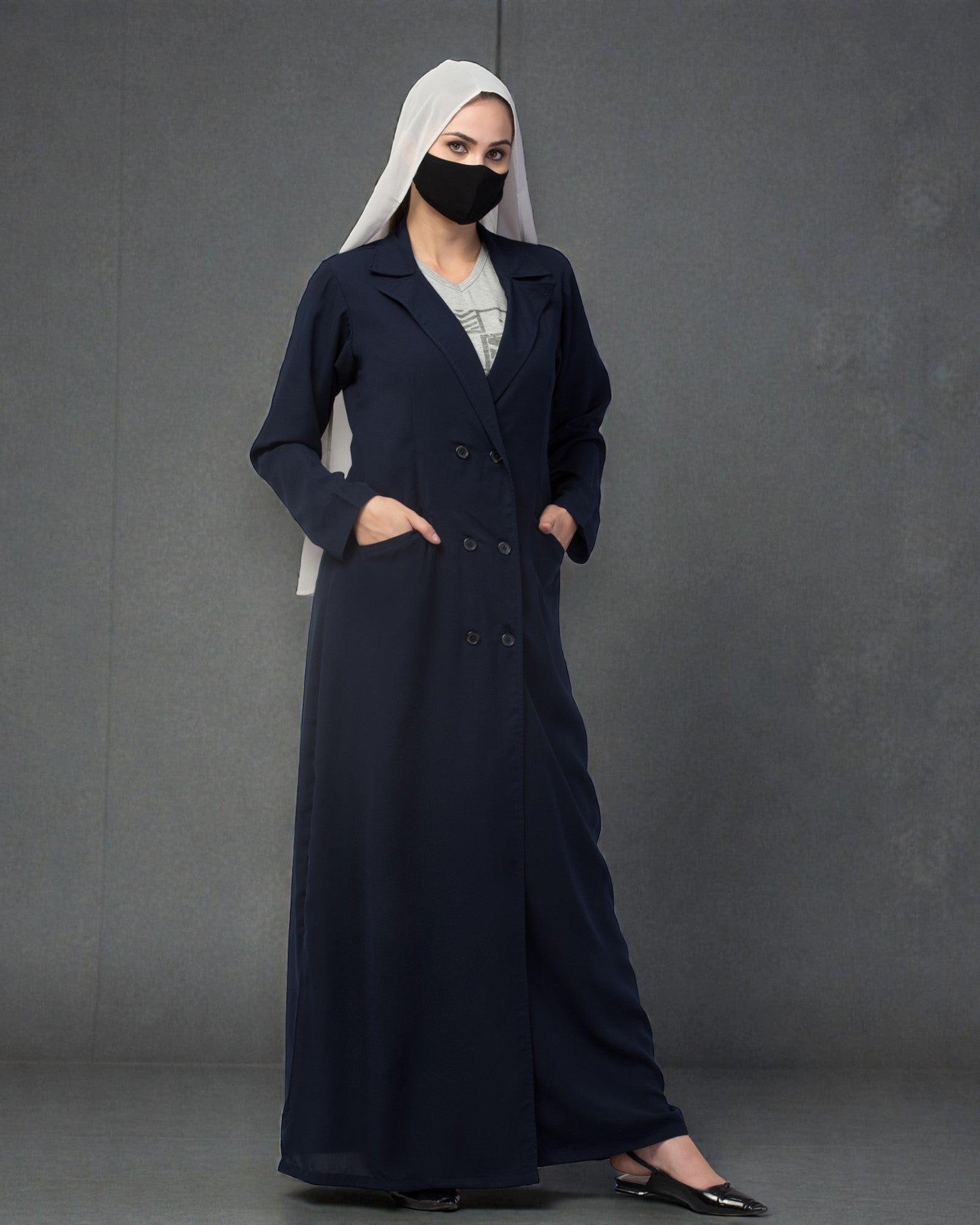 This Double Breasted Coat style abaya comes with Two Front Pockets.
