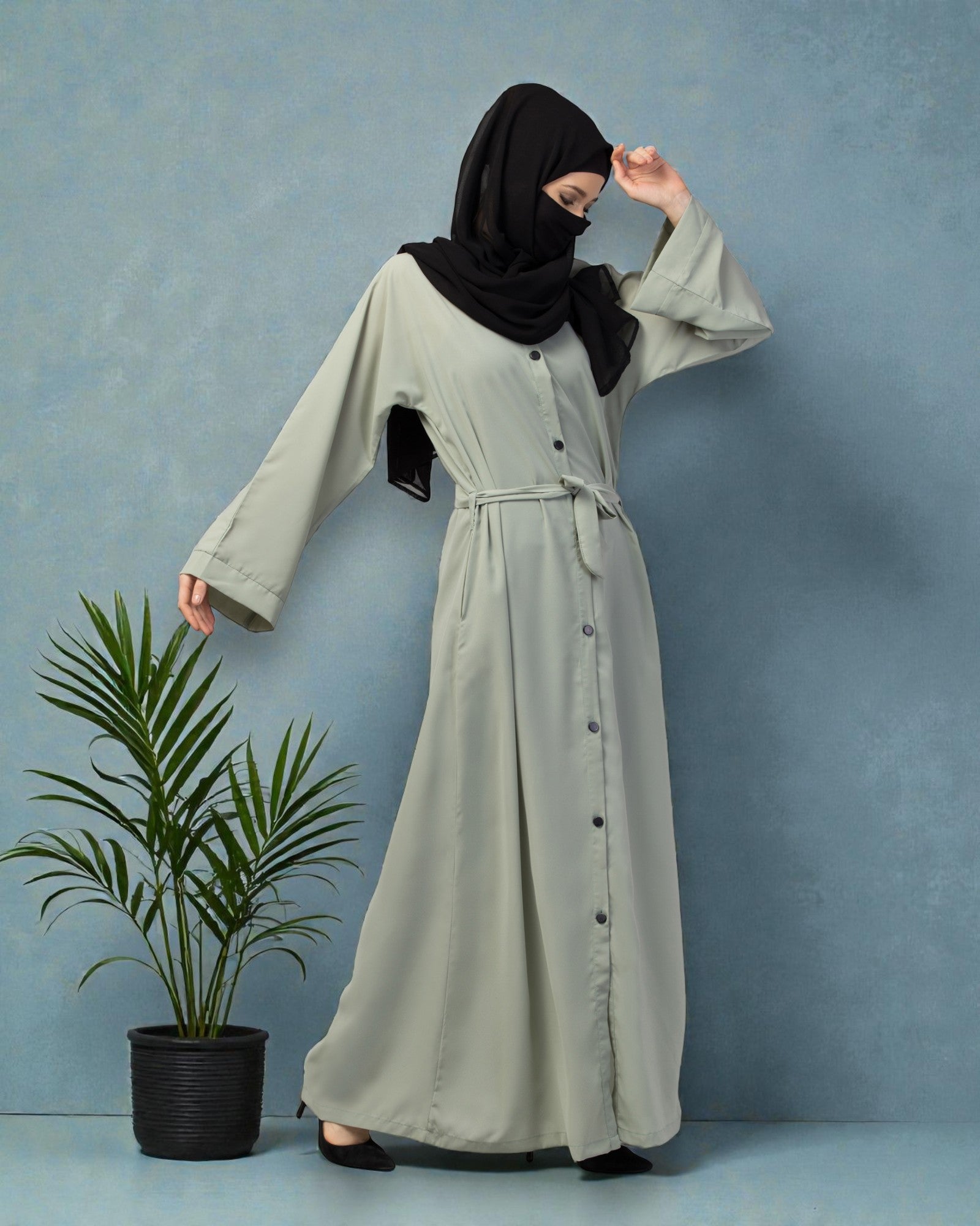 This A-Line Shape Abaya has a mandarin collar and loose shoulder.