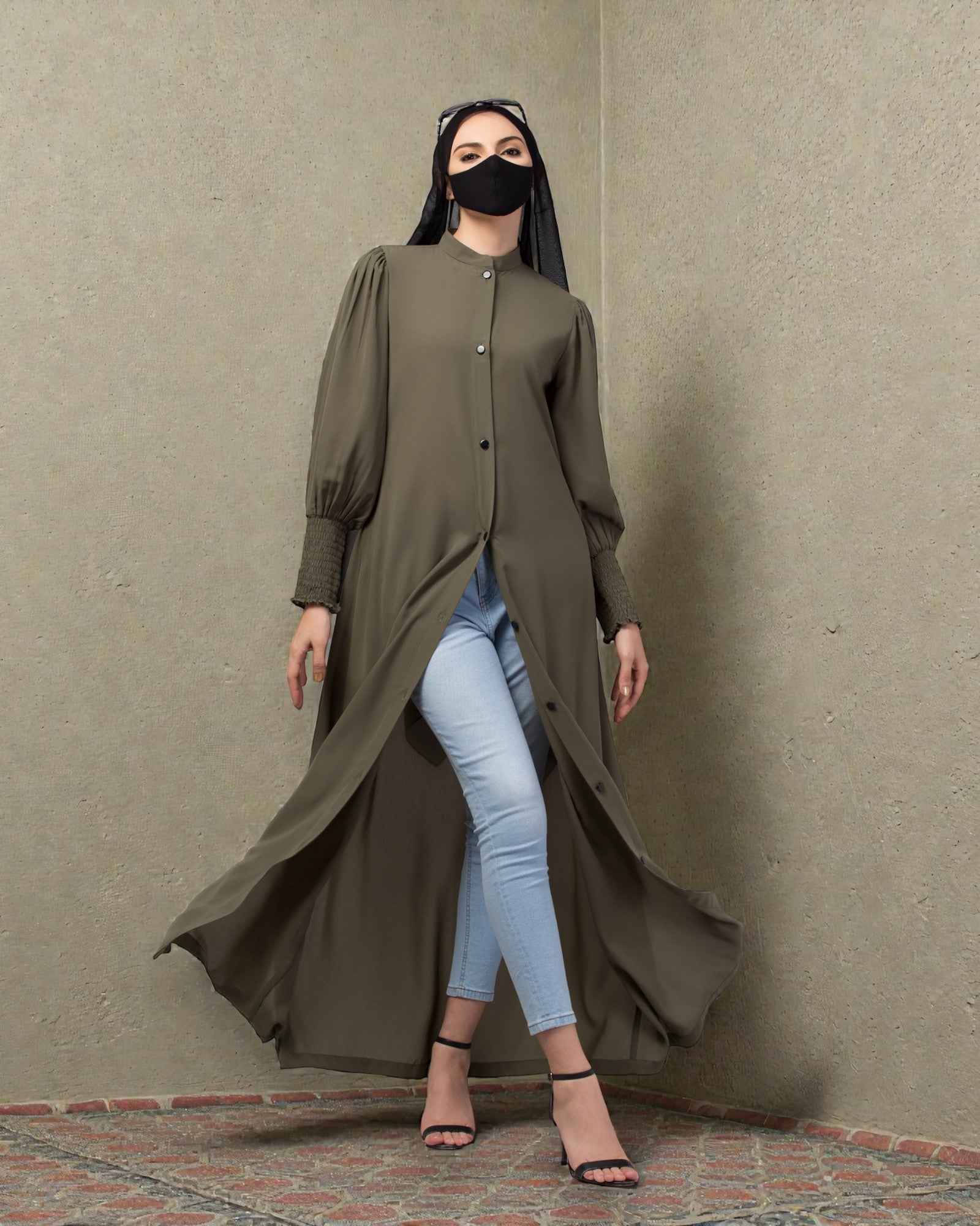 Elevate your style with our chic Front Open Abaya in Firdaus Fabric. Designed with unique Puffy Shoulders, elegant Designer Sleeves, and a stylish Mandarin Collar adorned with Contrast Buttons, this captivating abaya is a true fashion statement. For added versatility, it comes without a stole hijab, allowing you to explore various styling options effortlessly. Empower your look with confidence.