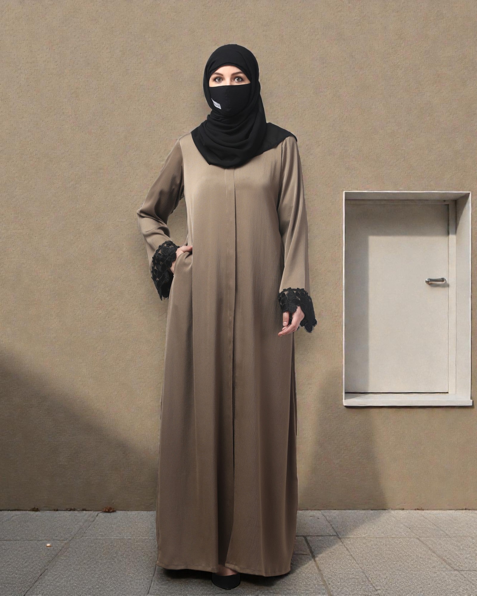 Front Open Abaya in Tiktok Polyester – Silky Elegance with Lace Accents