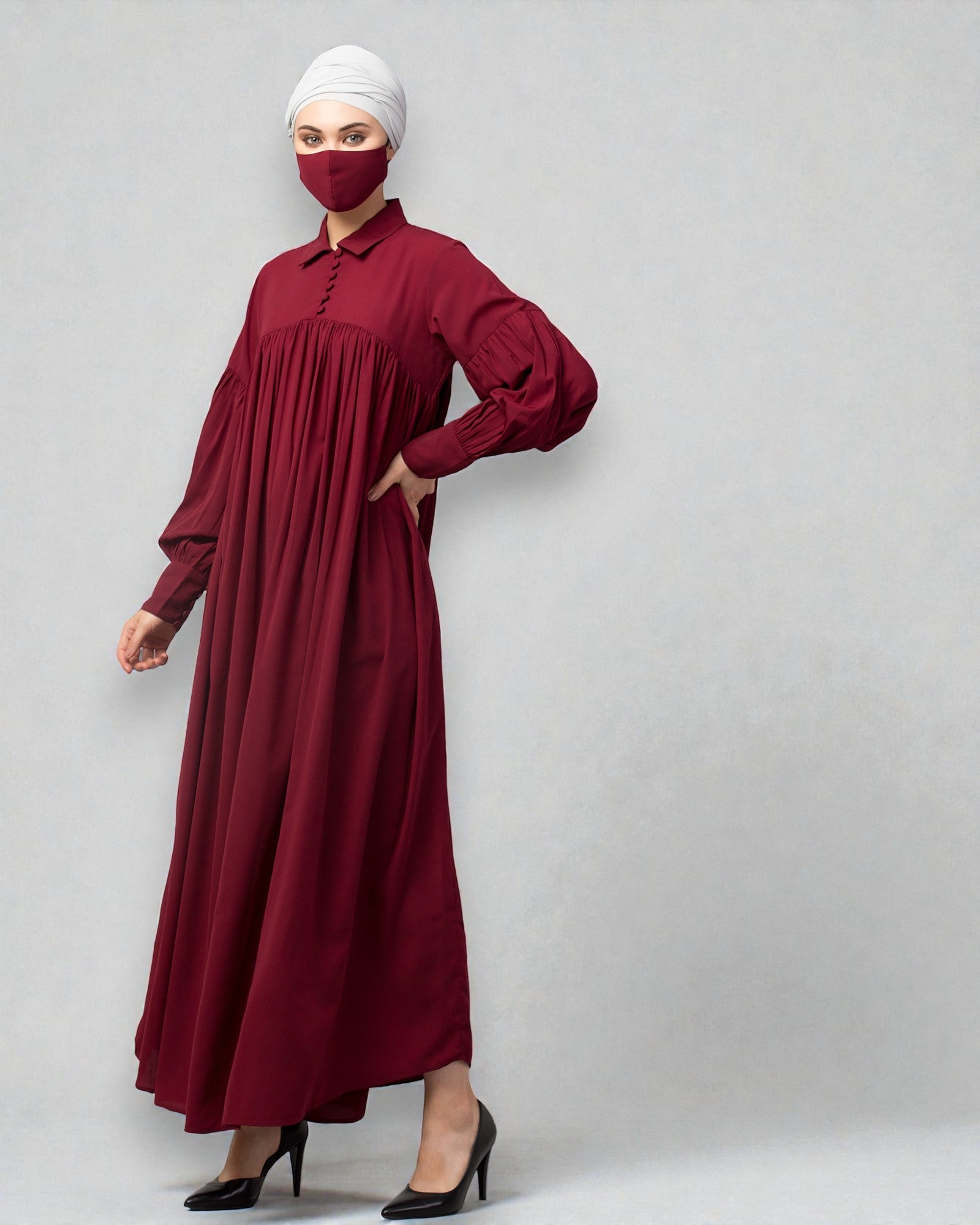 Gather and matching buttons further beautify this abaya.