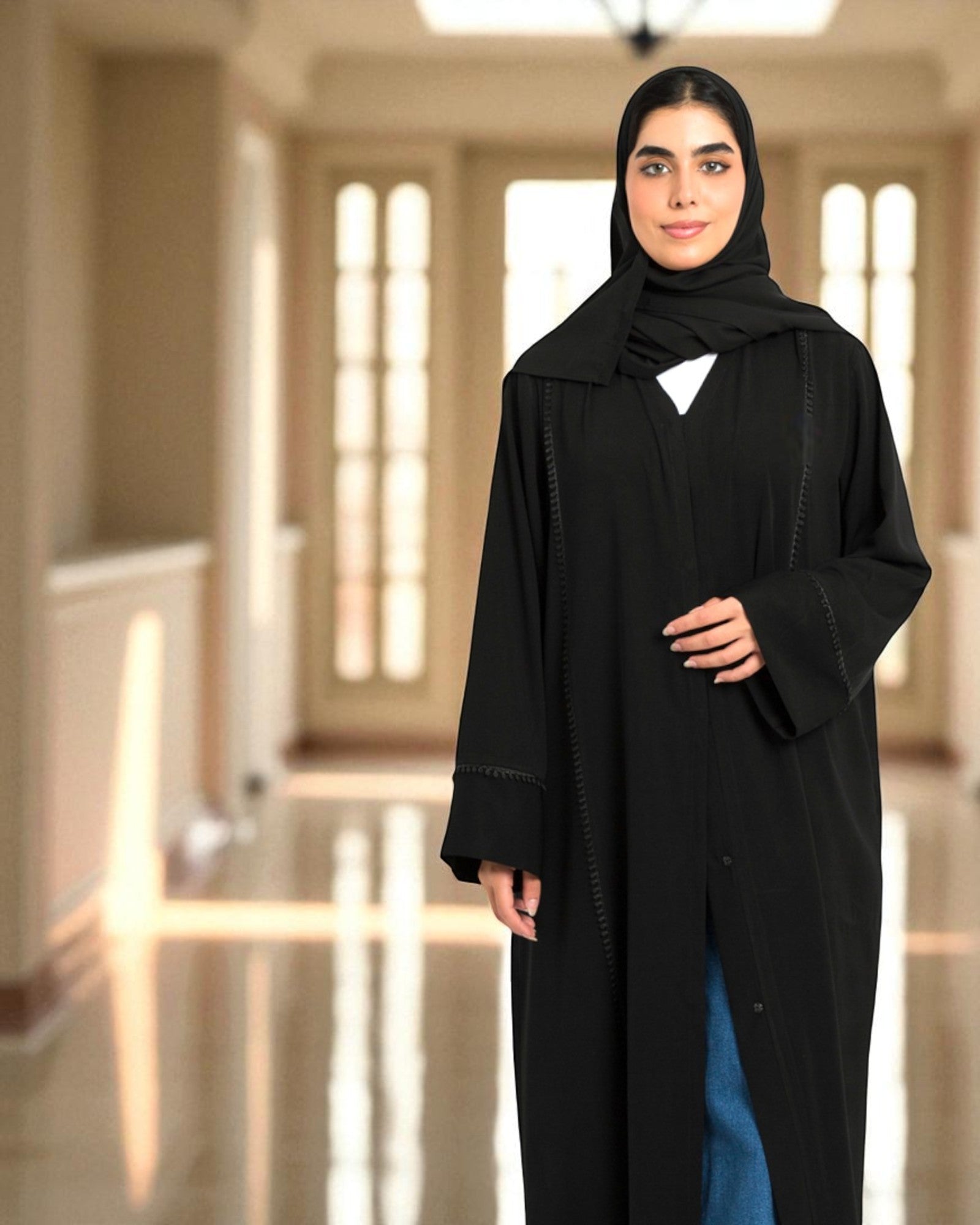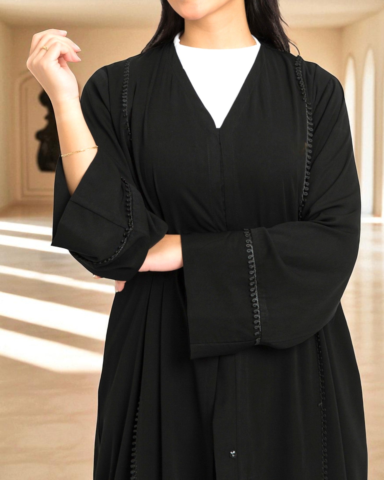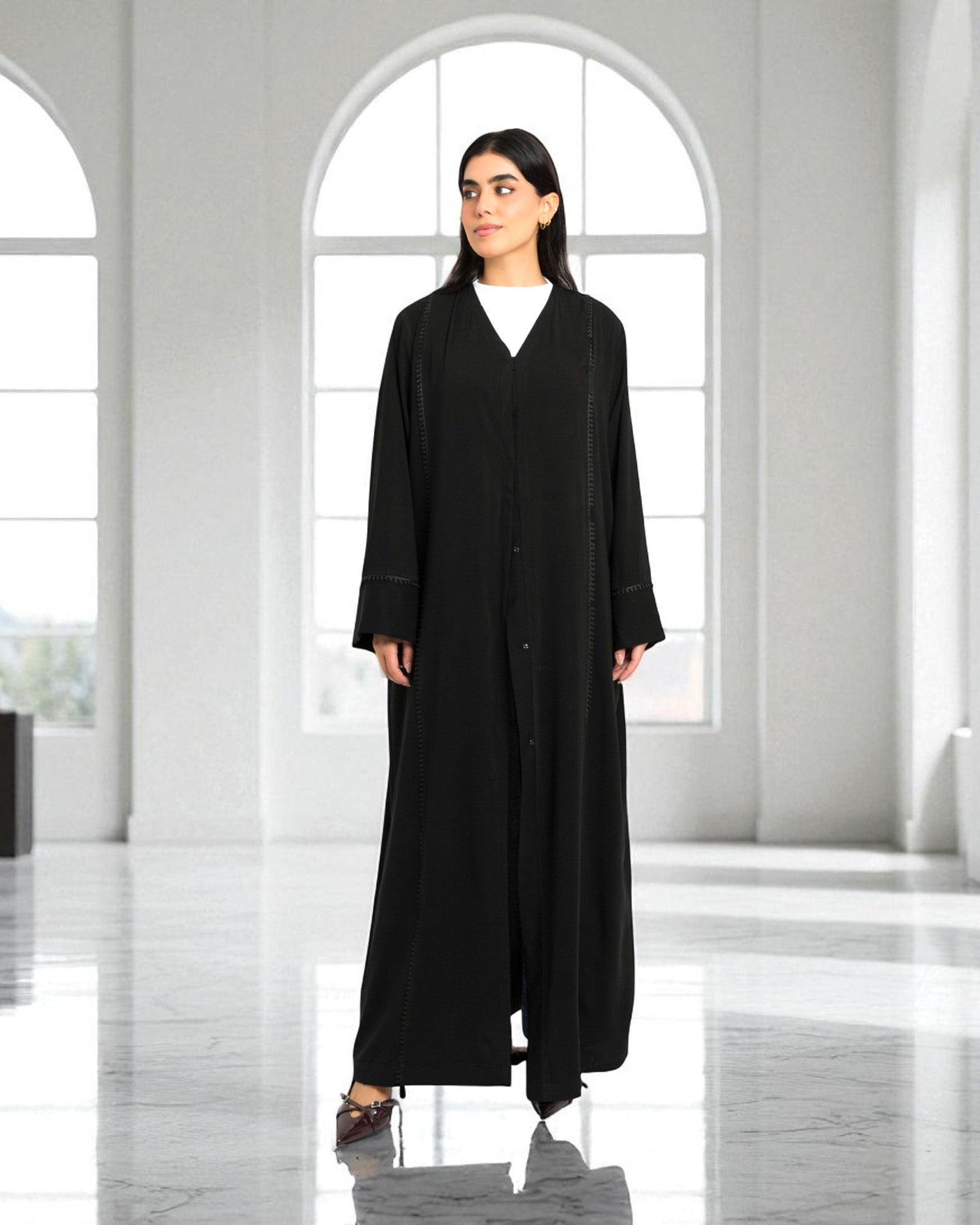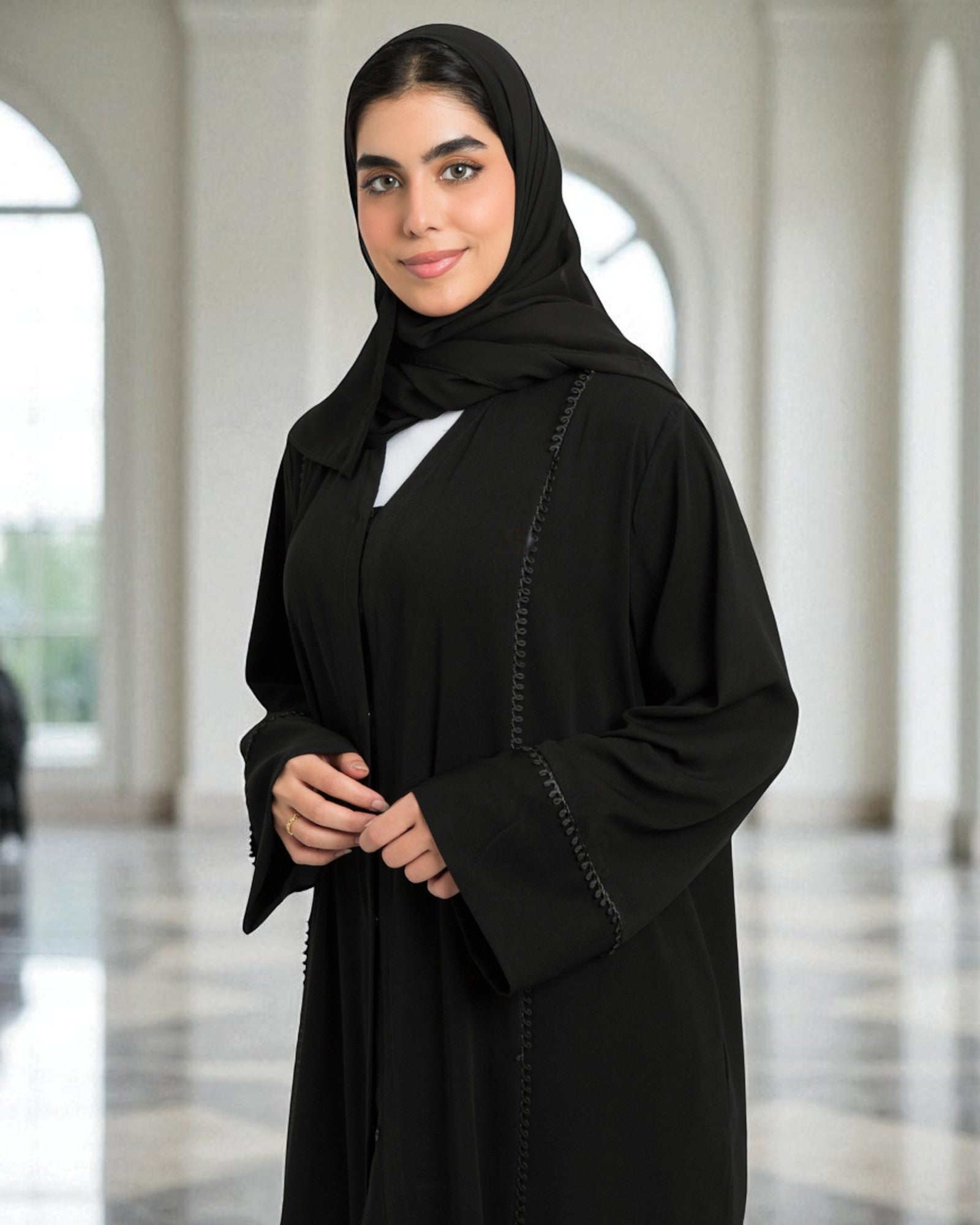 Add a touch of elegance to your wardrobe with our Front Open Abaya, featuring intricate lacework that exudes sophistication. Crafted from luxurious Firdaus fabric, this abaya offers a soft, comfortable feel and a beautiful drape. The wide sleeves provide ease of movement, and the V-neck design adds a modern flair to your look. With convenient side pockets and a complementary hijab, this abaya is perfect for any occasion, from casual outings to special events.