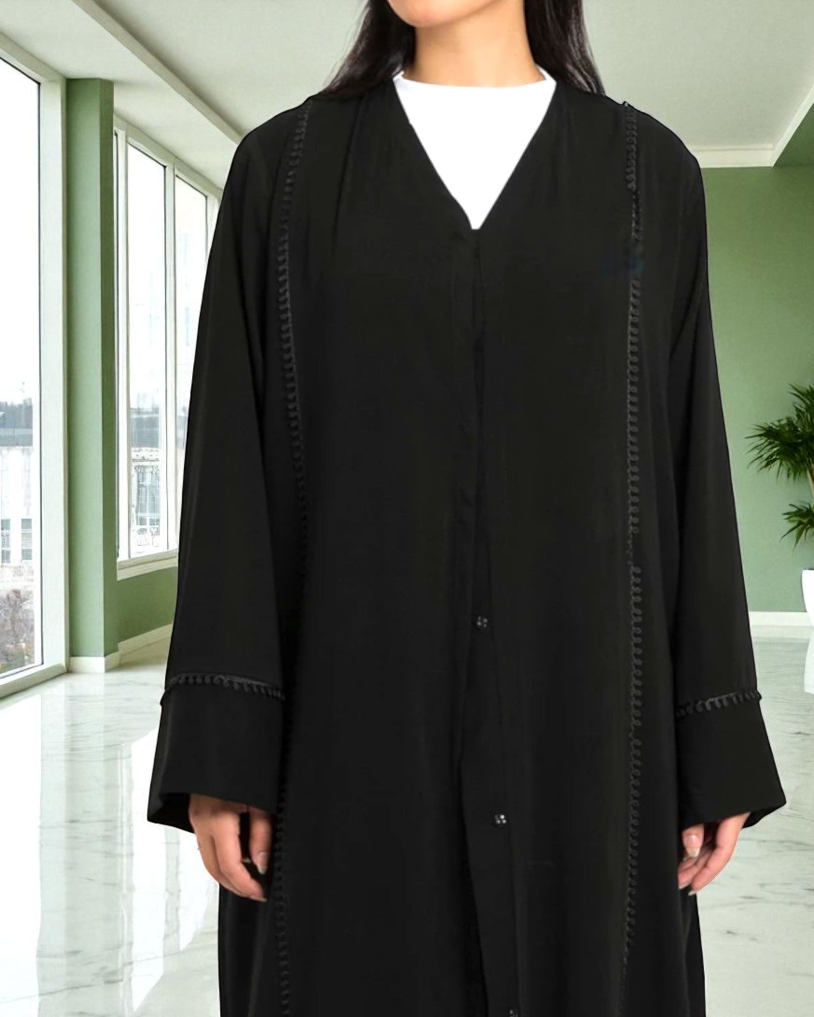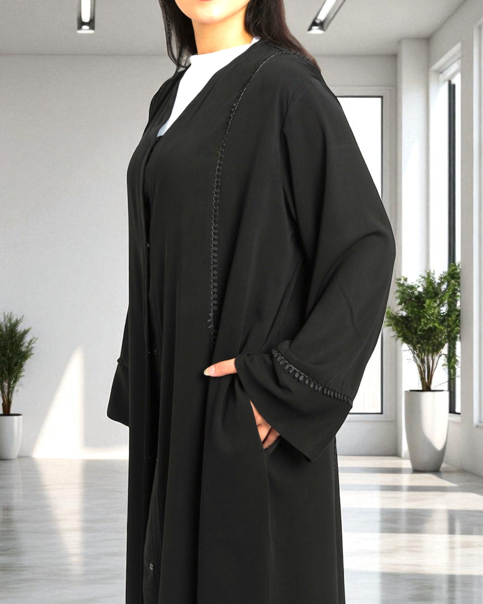 Front Open Abaya with Lacework - Firdaus Fabric - Wide Sleeves - Side Pockets - V Neck Design - Complementary Hijab