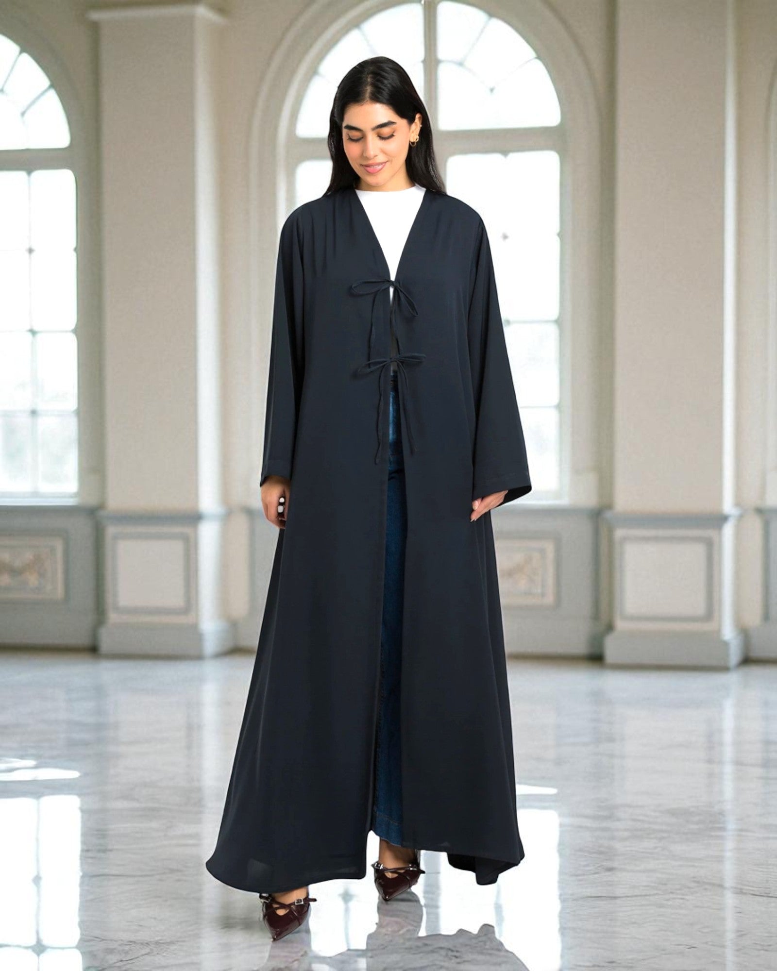 Experience the blend of style and comfort with our Shrug Like Abaya, crafted from luxurious Firdaus fabric for a soft, elegant feel. This abaya features a unique ribbon closure that allows you to tie and secure it as per your preference. The wide sleeves and V-neck design add a modern flair to your outfit, while the side pockets provide practical functionality. Complete with a complementary hijab, this abaya is perfect for any occasion, whether itβs a casual day out or a special event.