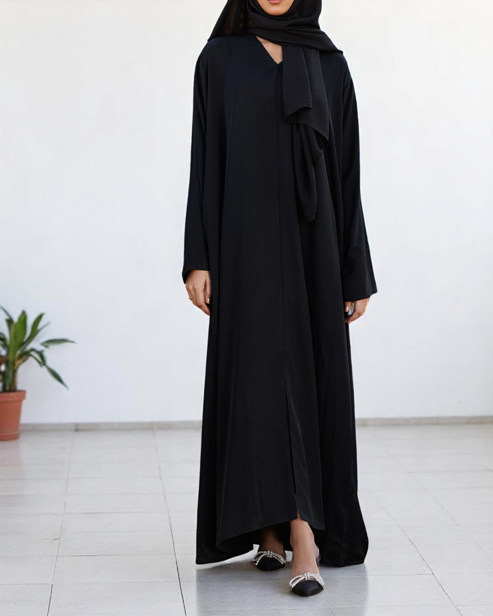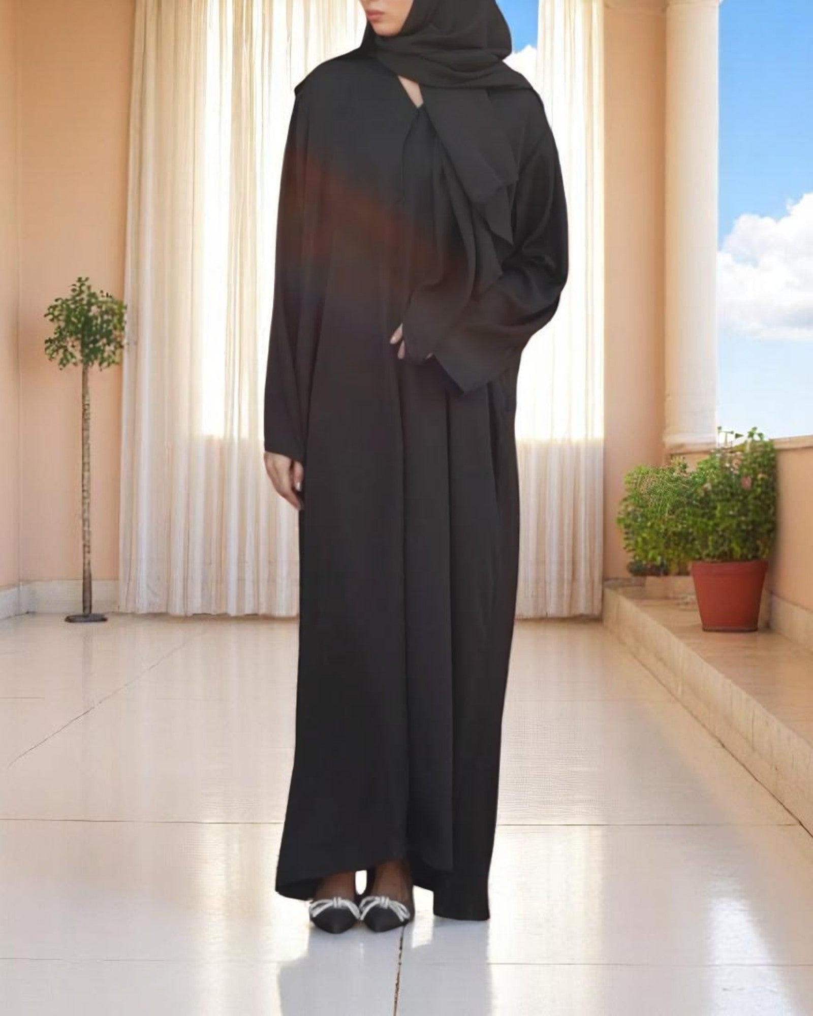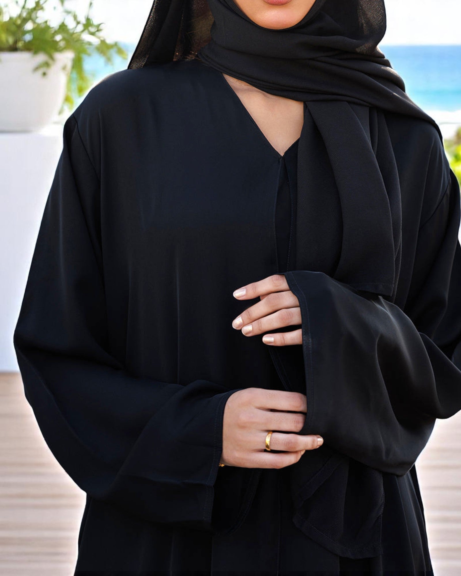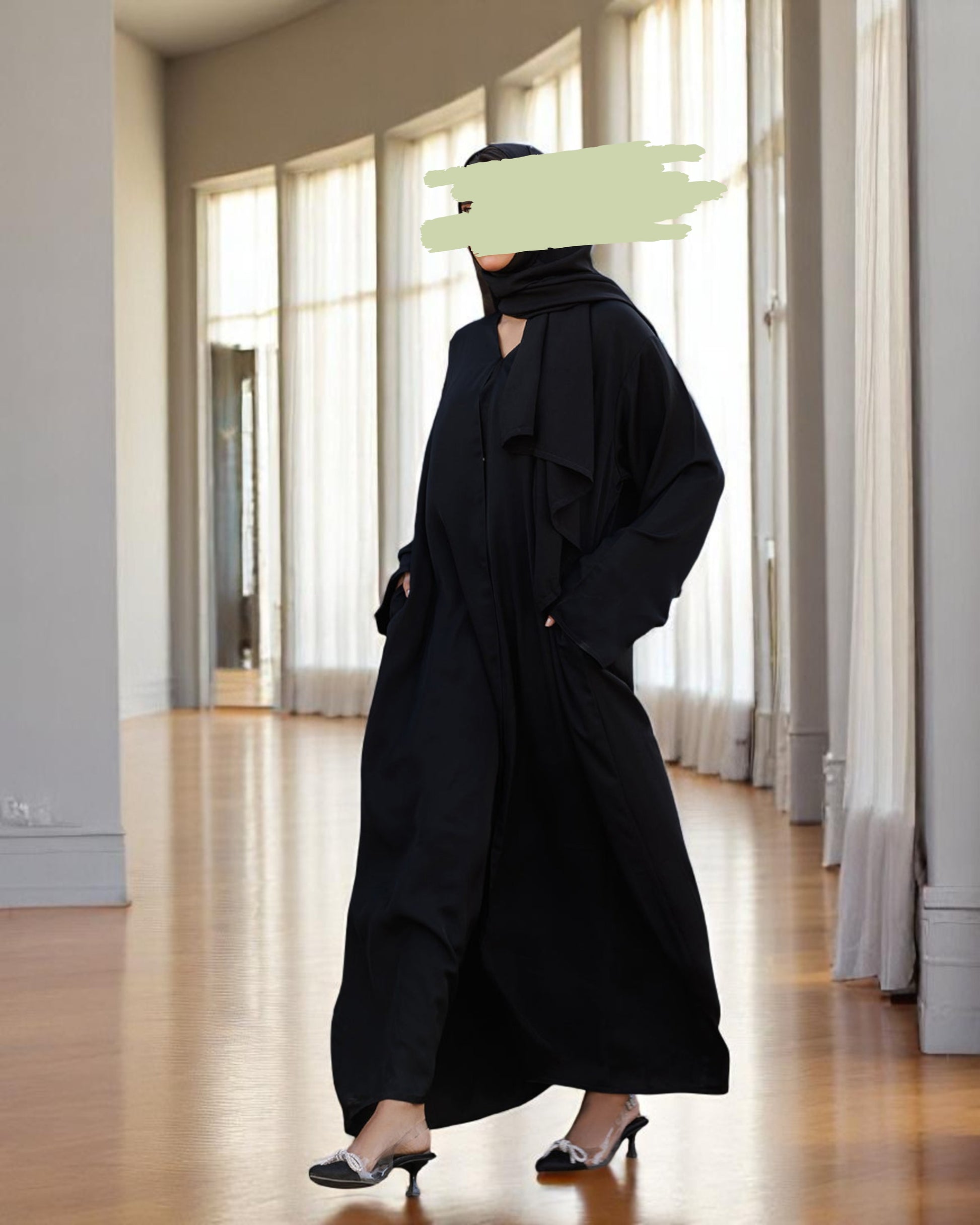 Elegant front open black abaya crafted in premium Firdaus fabricβlightweight, breathable, and easy to maintain. Features wide sleeves for ease during wudu (ablution), a flattering V-neckline, and snap-on buttons for effortless wear. Thoughtfully designed with side pockets for practicality.