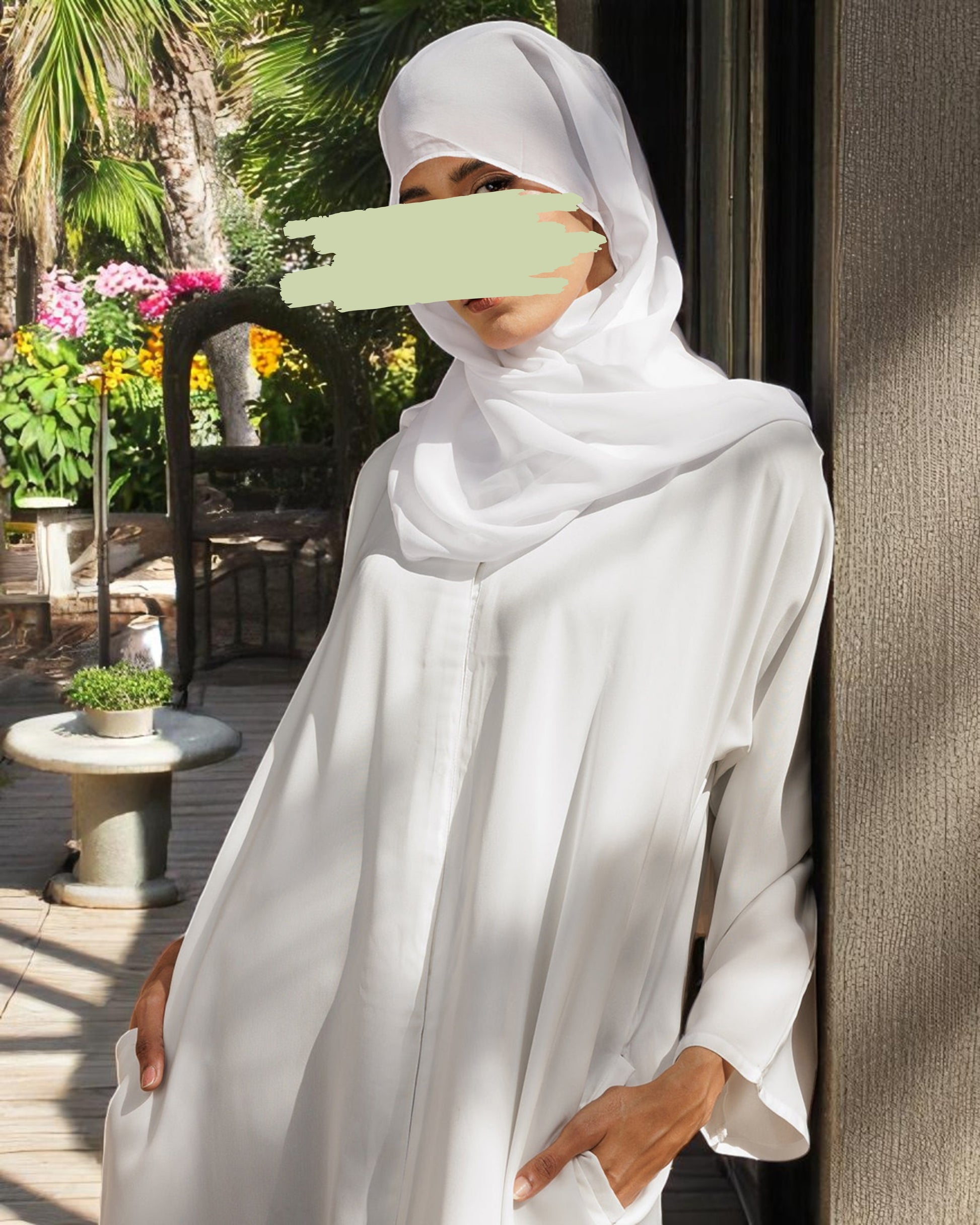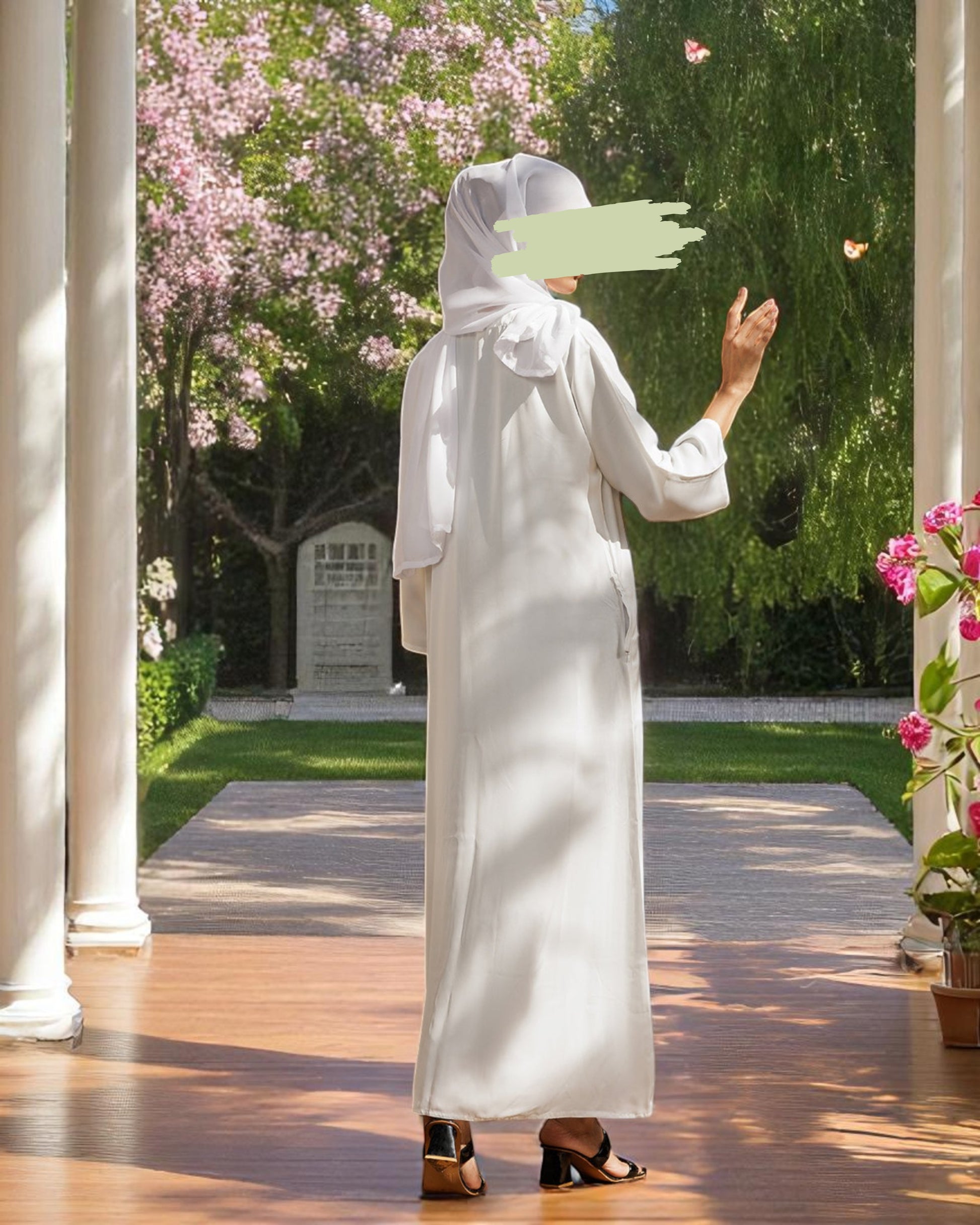 Crafted in breathable and easy-to-maintain Firdaus fabric, this front open white abaya blends simplicity with elegance. It features a modest V-neckline, snap-on buttons for quick closure, and functional side pockets. The wide sleeves ensure ease during wudu (ablution), making it a perfect choice for daily wear with a graceful, contemporary touch.
