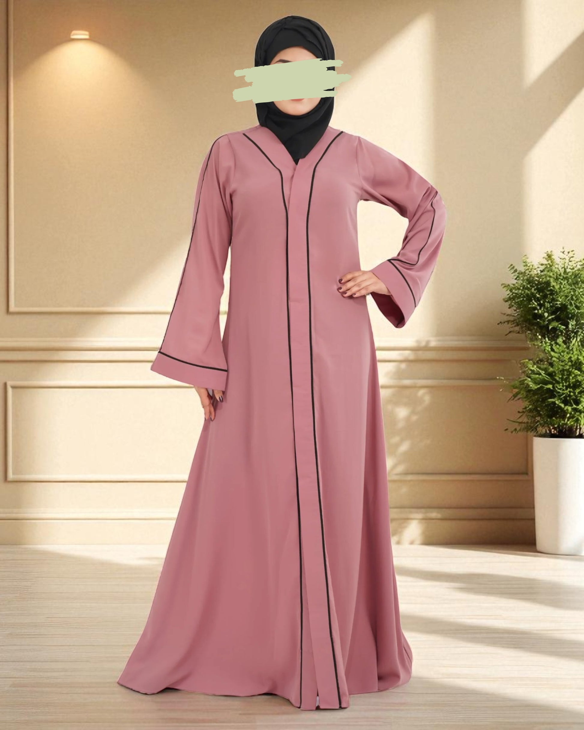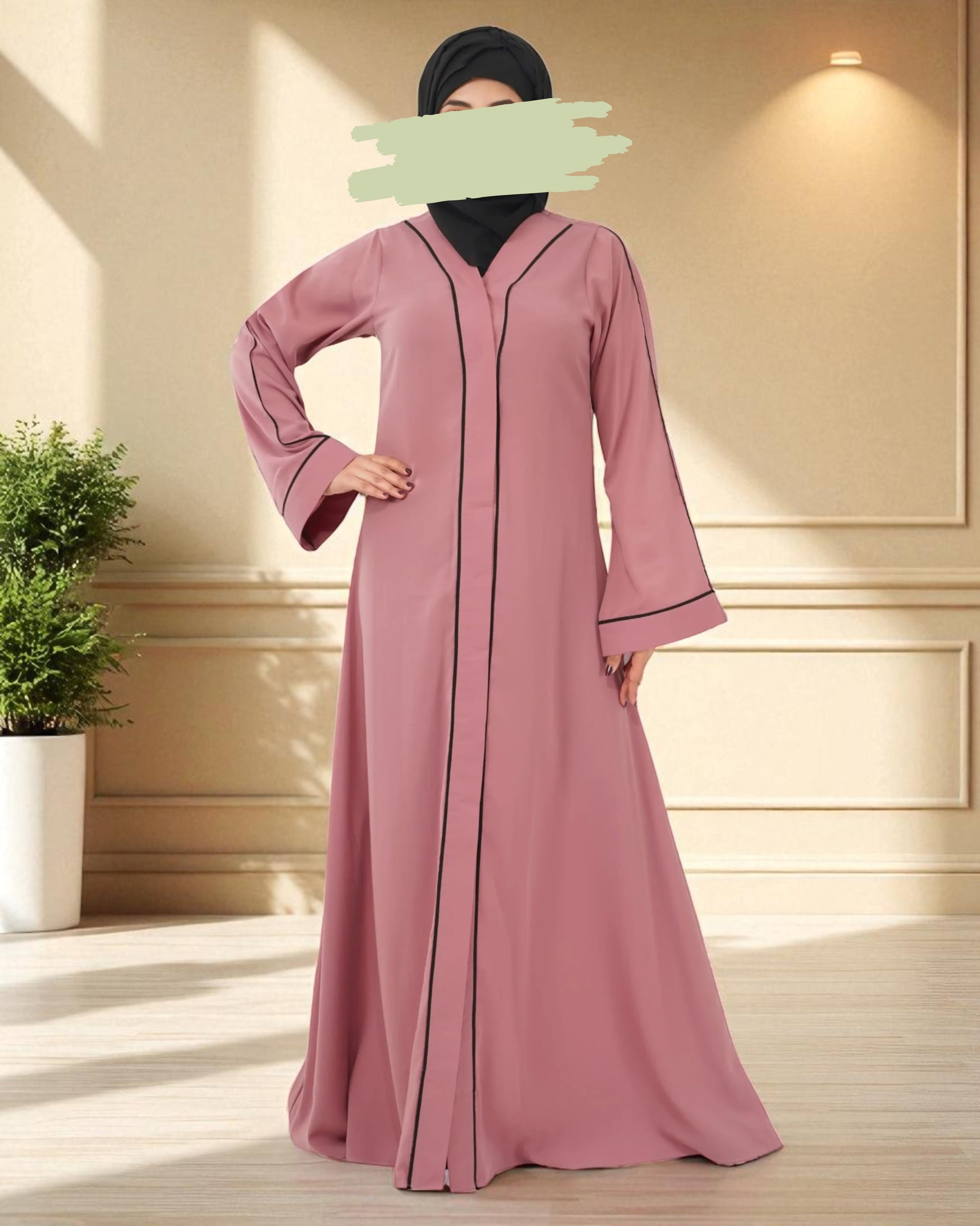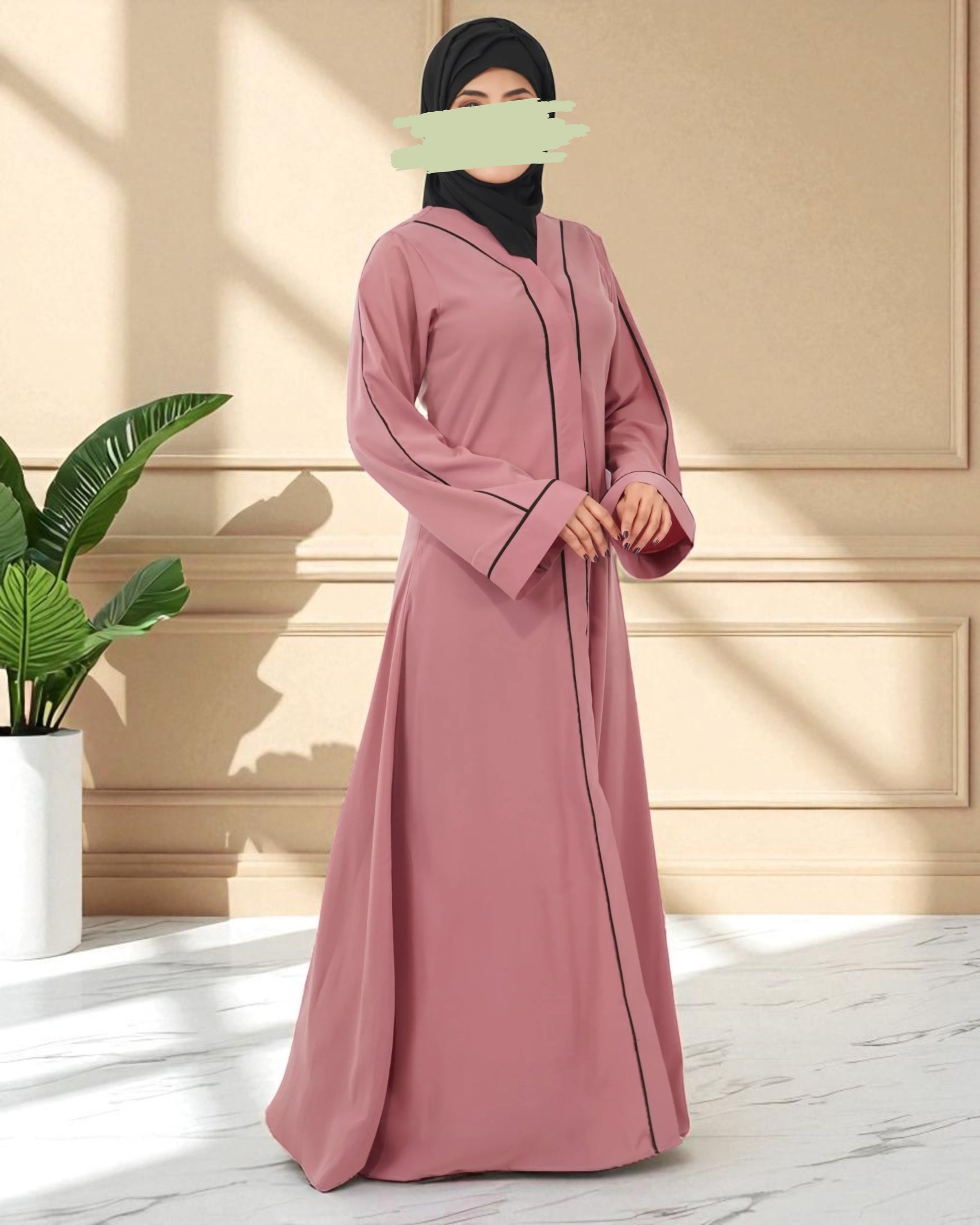This front open abaya is tailored in breathable, easy-to-maintain Firdaus fabric and features contrast color pipings on the panel and sleeves for a subtle yet stylish touch. Designed with wide sleeves for wudu (ablution) ease, snap-on buttons for convenience, and side pockets for utility. The elegant V-neckline adds to its modern, modest charmβperfect for everyday sophistication.