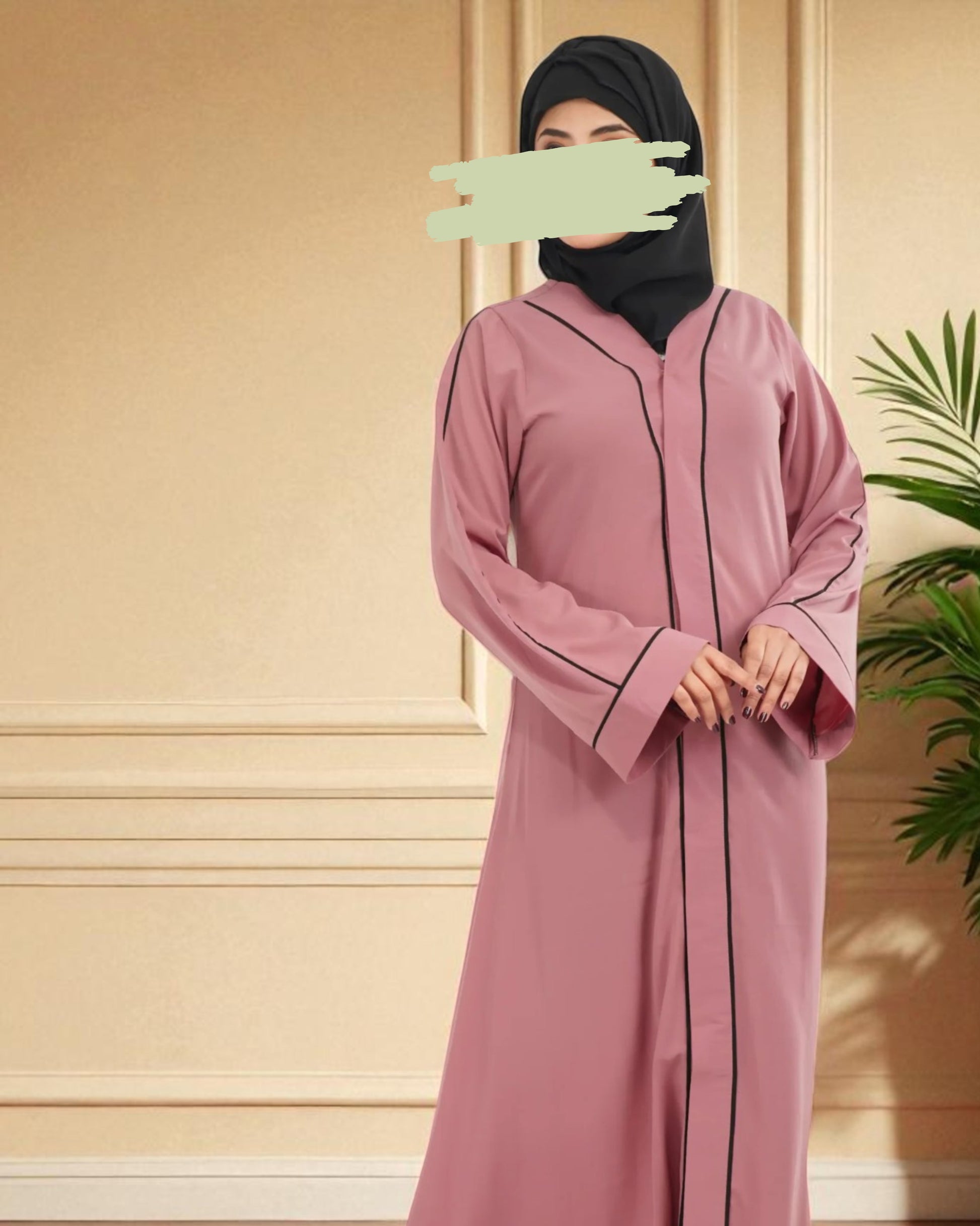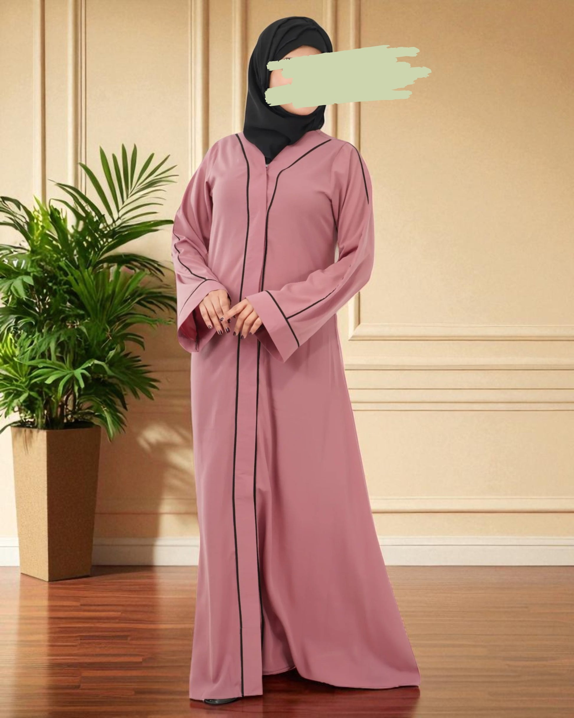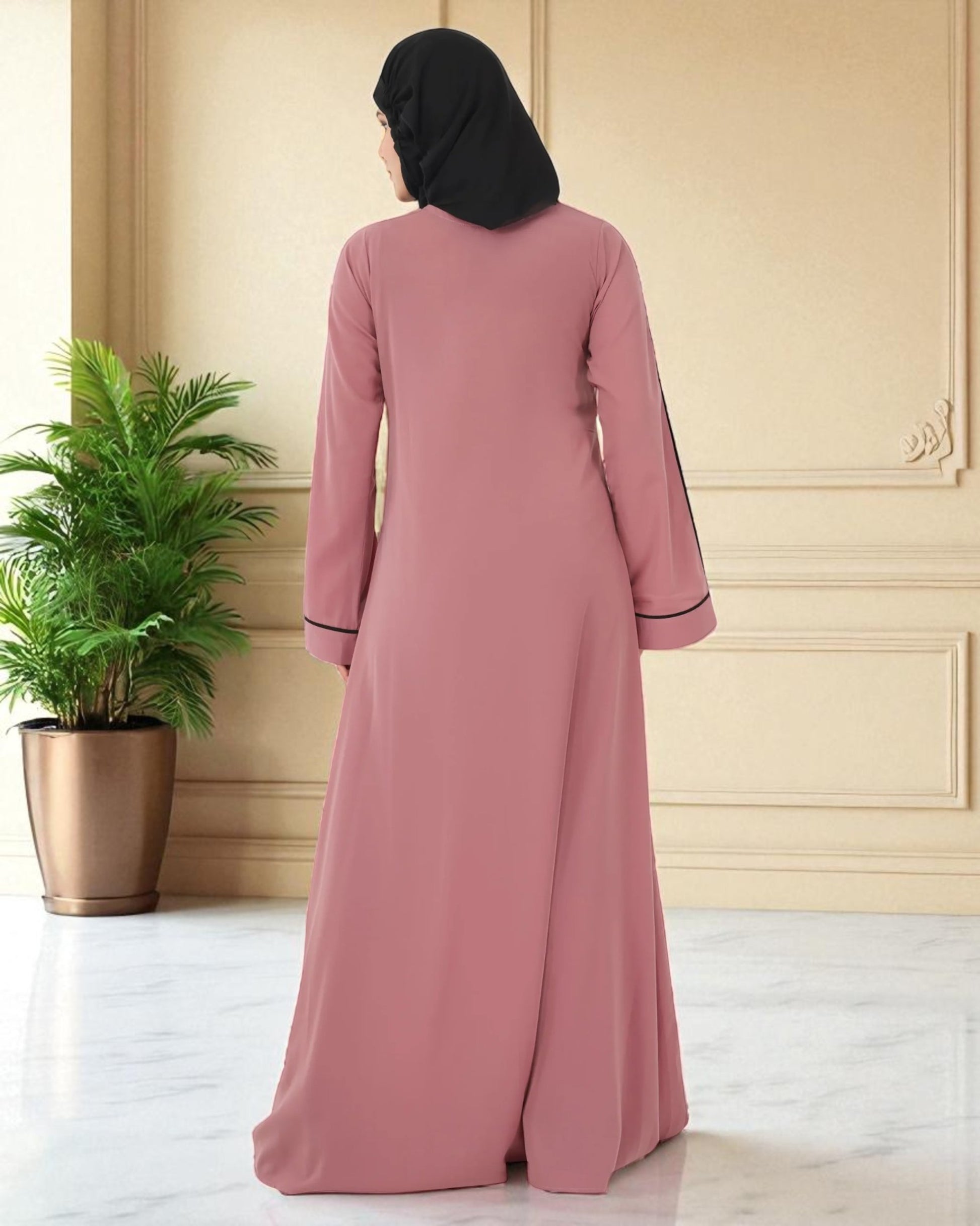 This front open abaya is tailored in breathable, easy-to-maintain Firdaus fabric and features contrast color pipings on the panel and sleeves for a subtle yet stylish touch. Designed with wide sleeves for wudu (ablution) ease, snap-on buttons for convenience, and side pockets for utility. The elegant V-neckline adds to its modern, modest charmβperfect for everyday sophistication.