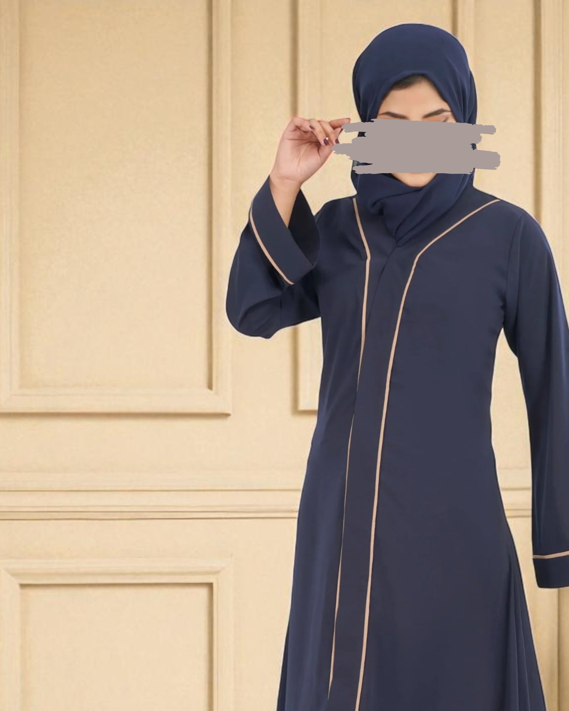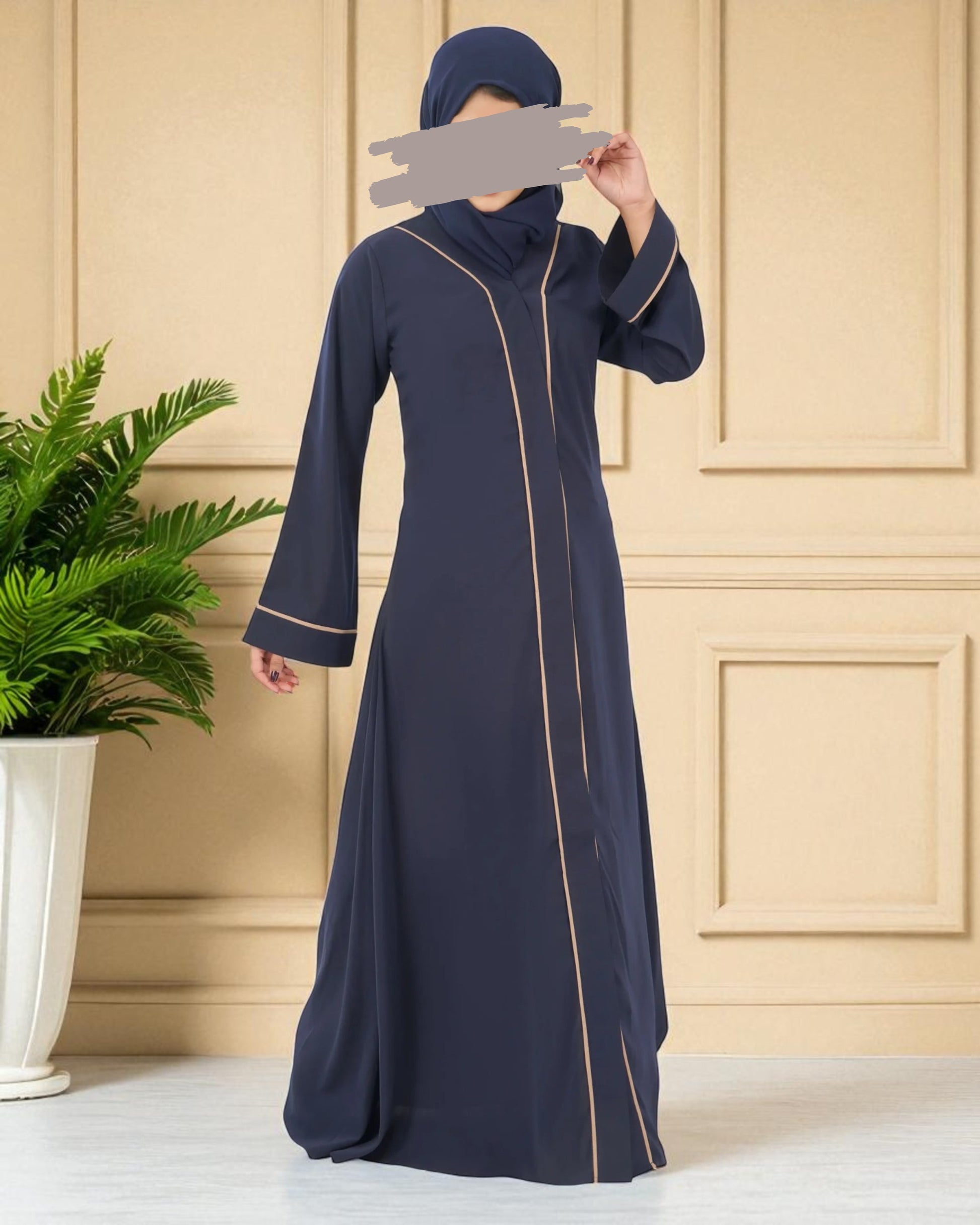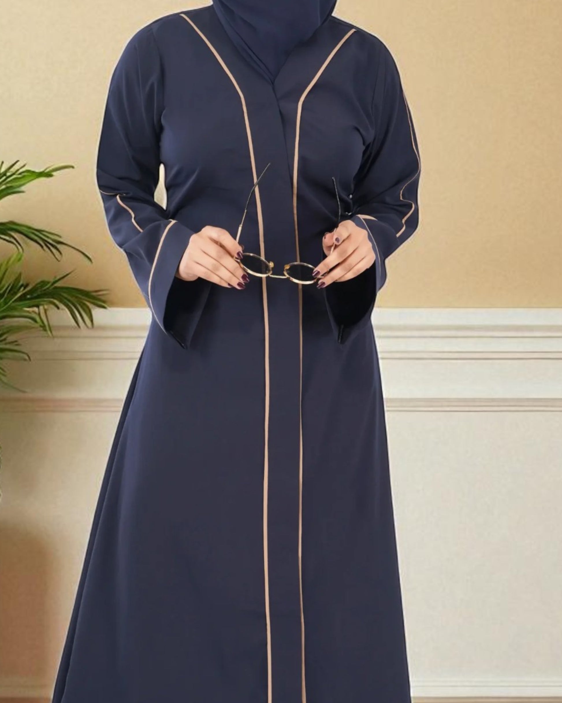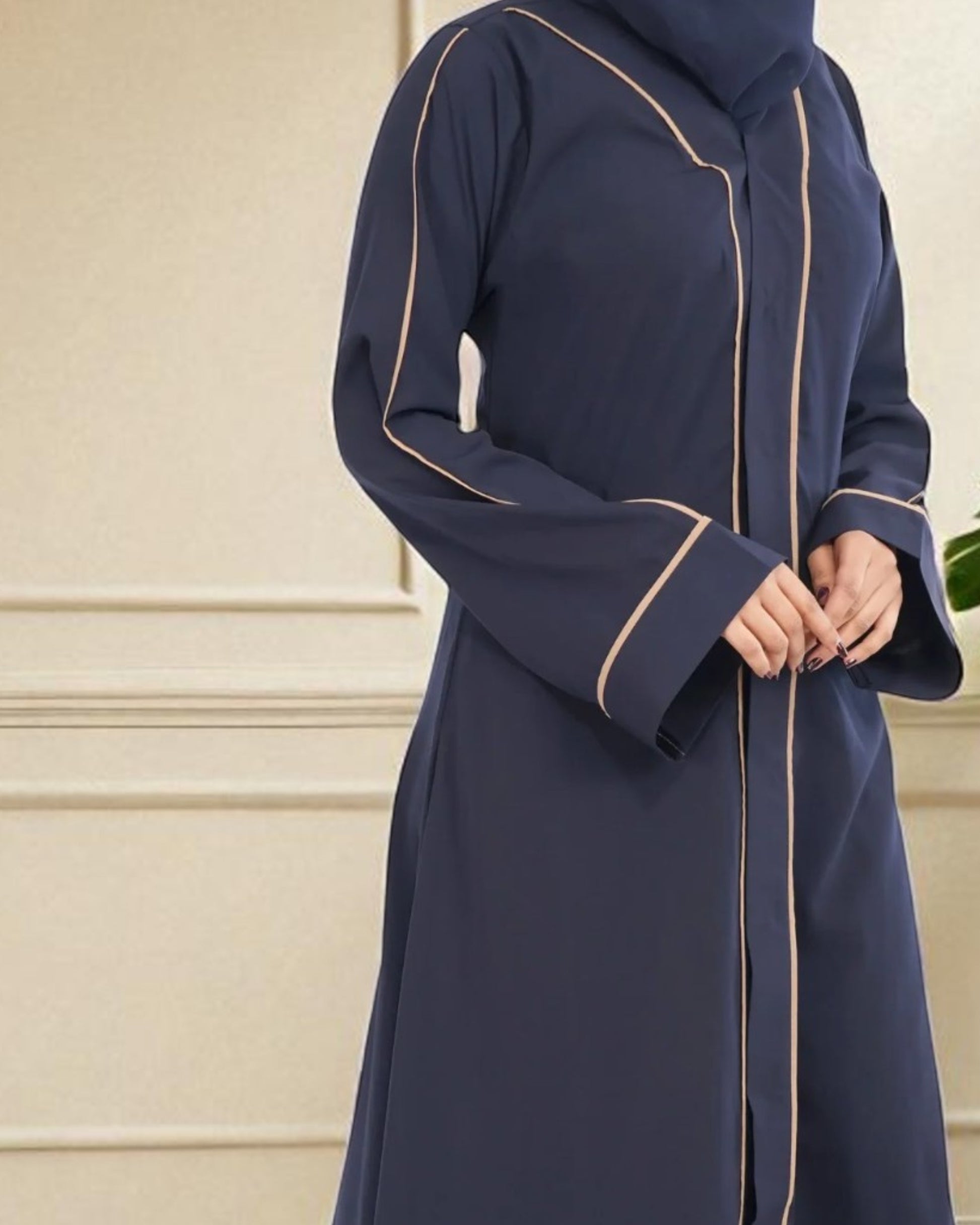 This front open abaya is tailored in breathable, easy-to-maintain Firdaus fabric and features contrast color pipings on the panel and sleeves for a subtle yet stylish touch. Designed with wide sleeves for wudu (ablution) ease, snap-on buttons for convenience, and side pockets for utility. The elegant V-neckline adds to its modern, modest charmβperfect for everyday sophistication.