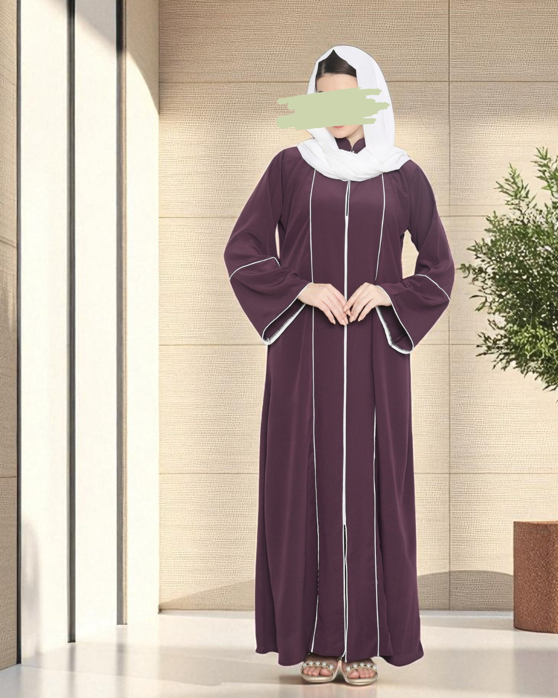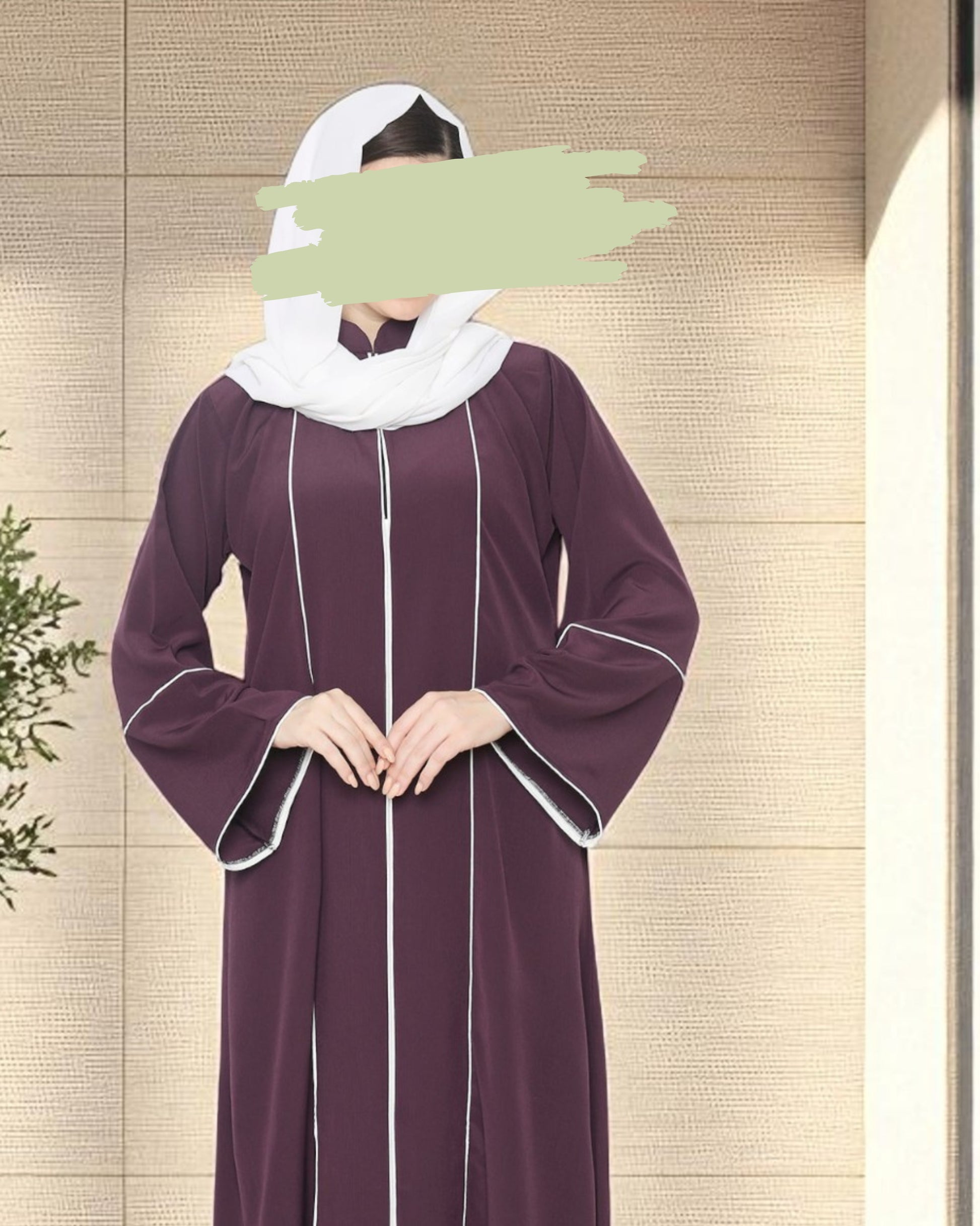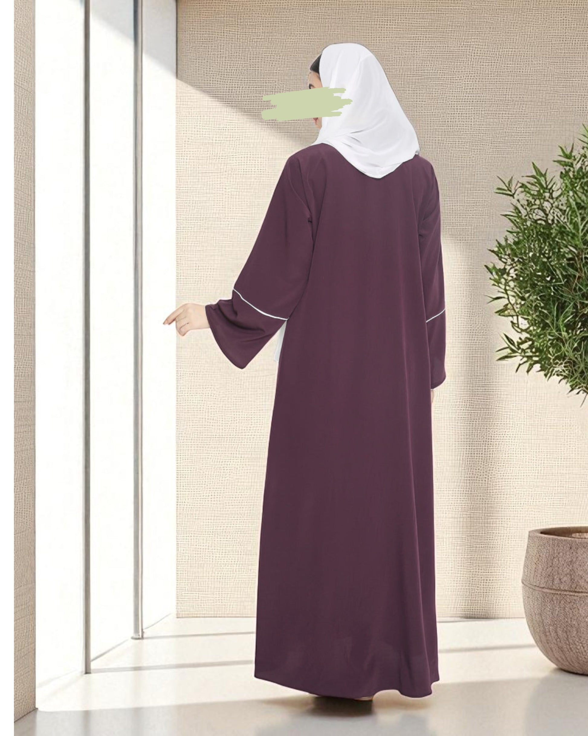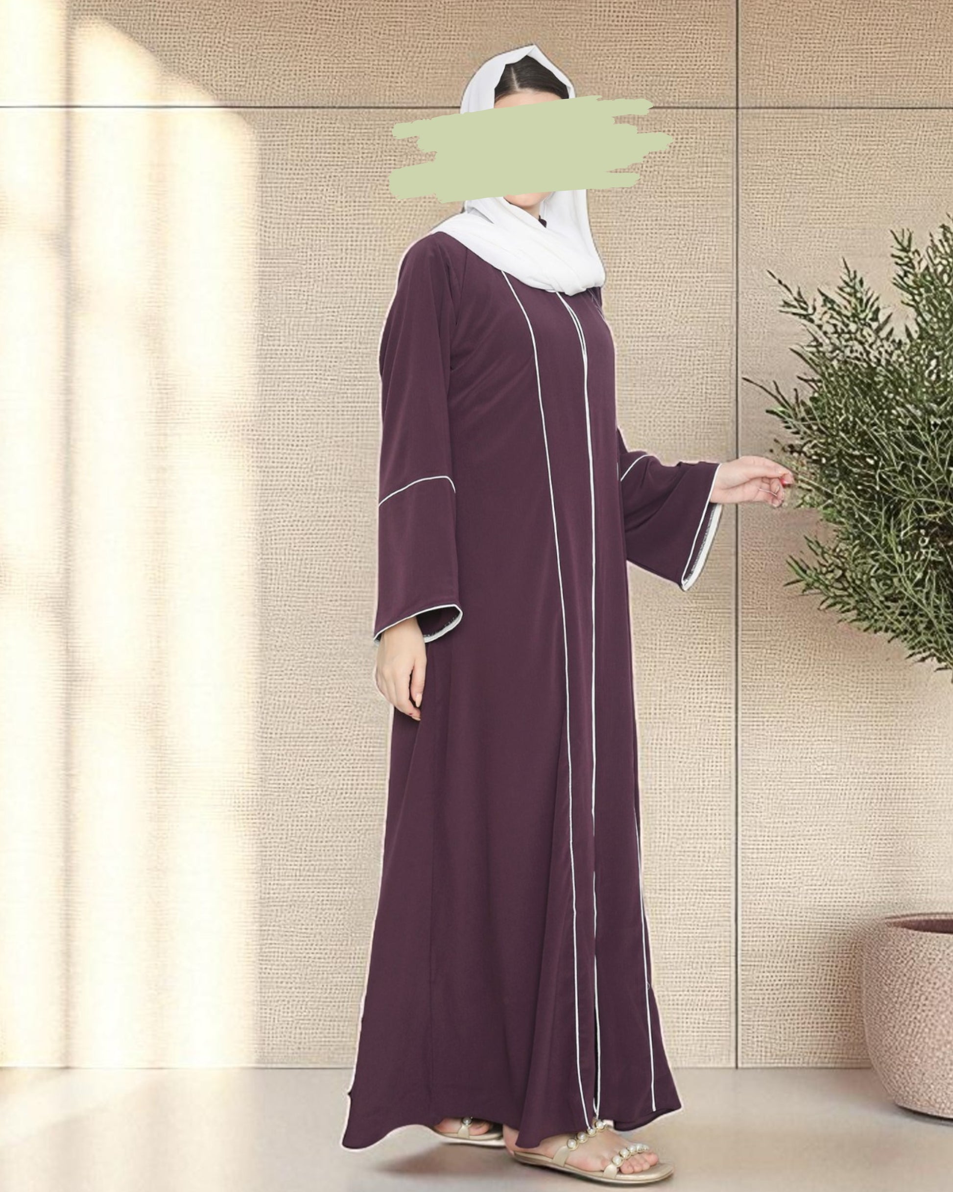 This front open abaya is crafted from very premium Praada fabric, offering a soft feel and a luxurious finish. Contrast color pipings run along the panel and sleeves, adding a stylish edge to its modest design. It features wide sleeves for easy wudu (ablution), snap-on buttons for comfort, side pockets for utility, and a smart V-necklineβperfect for daily wear with a designer flair.