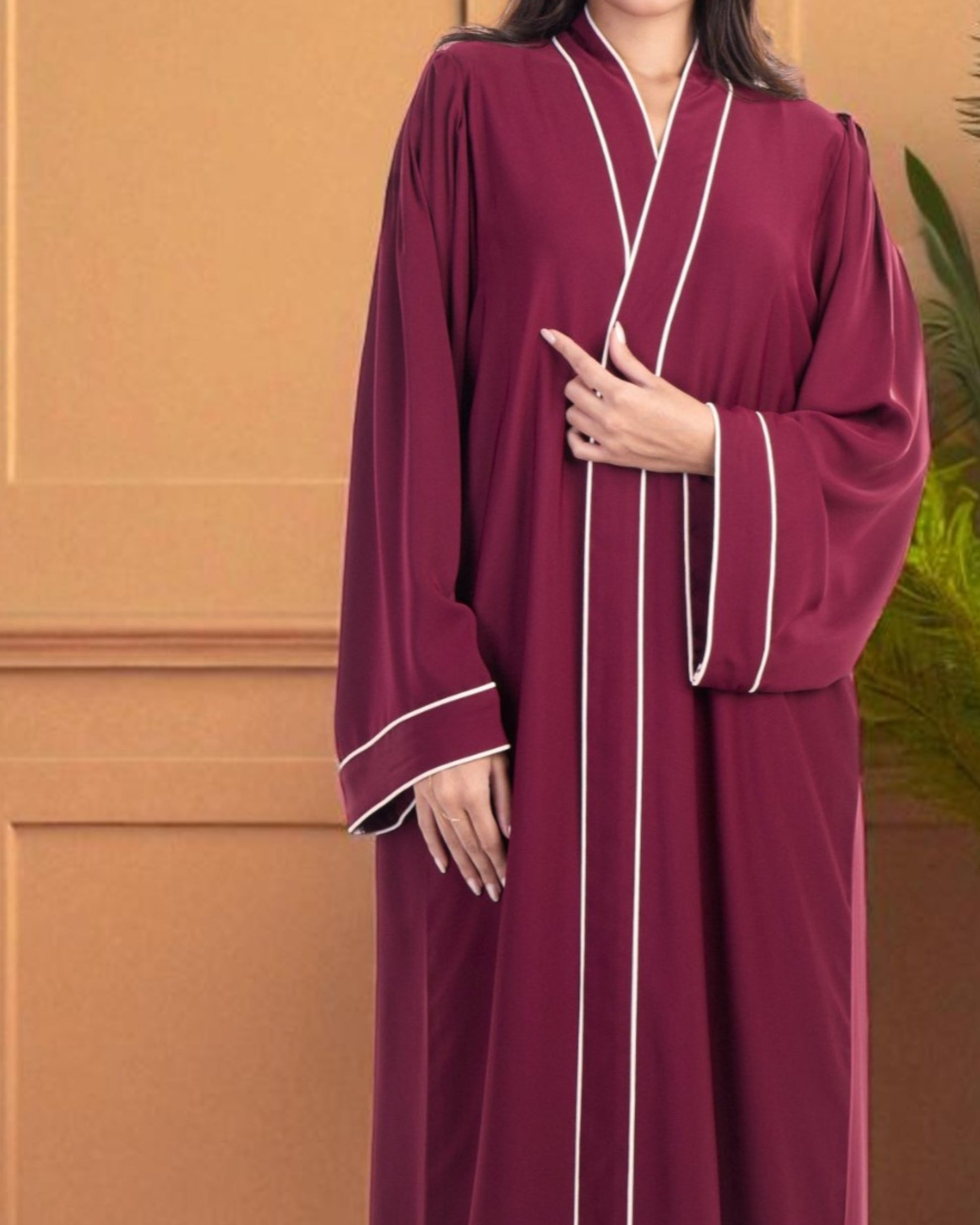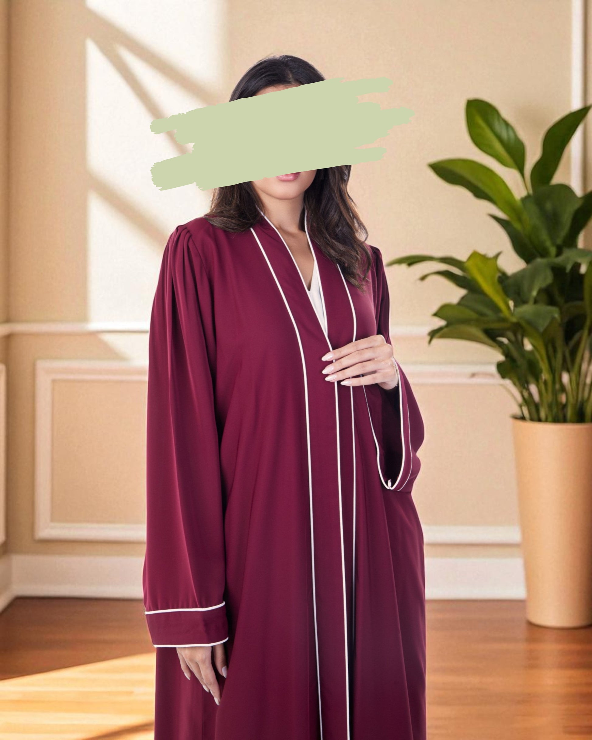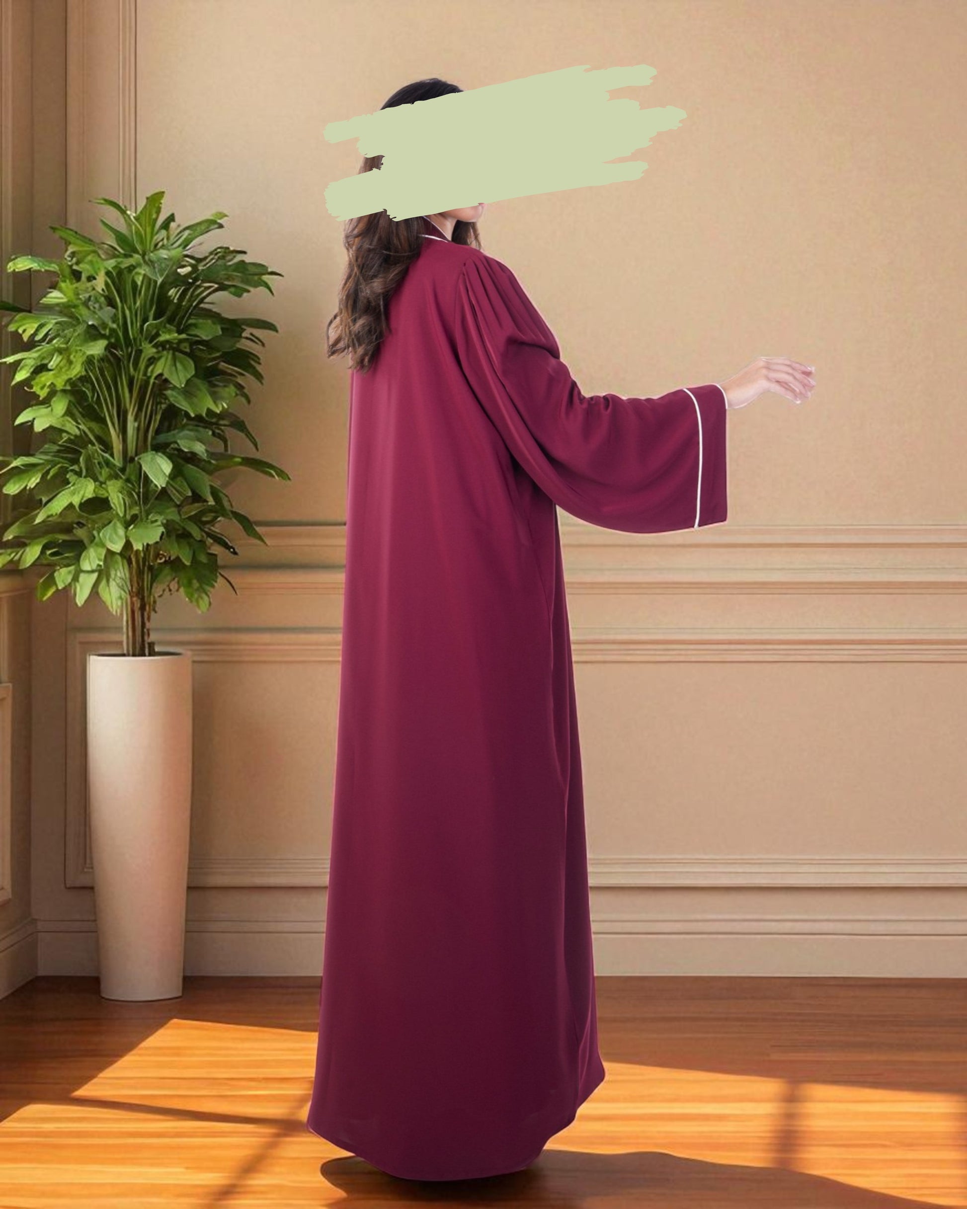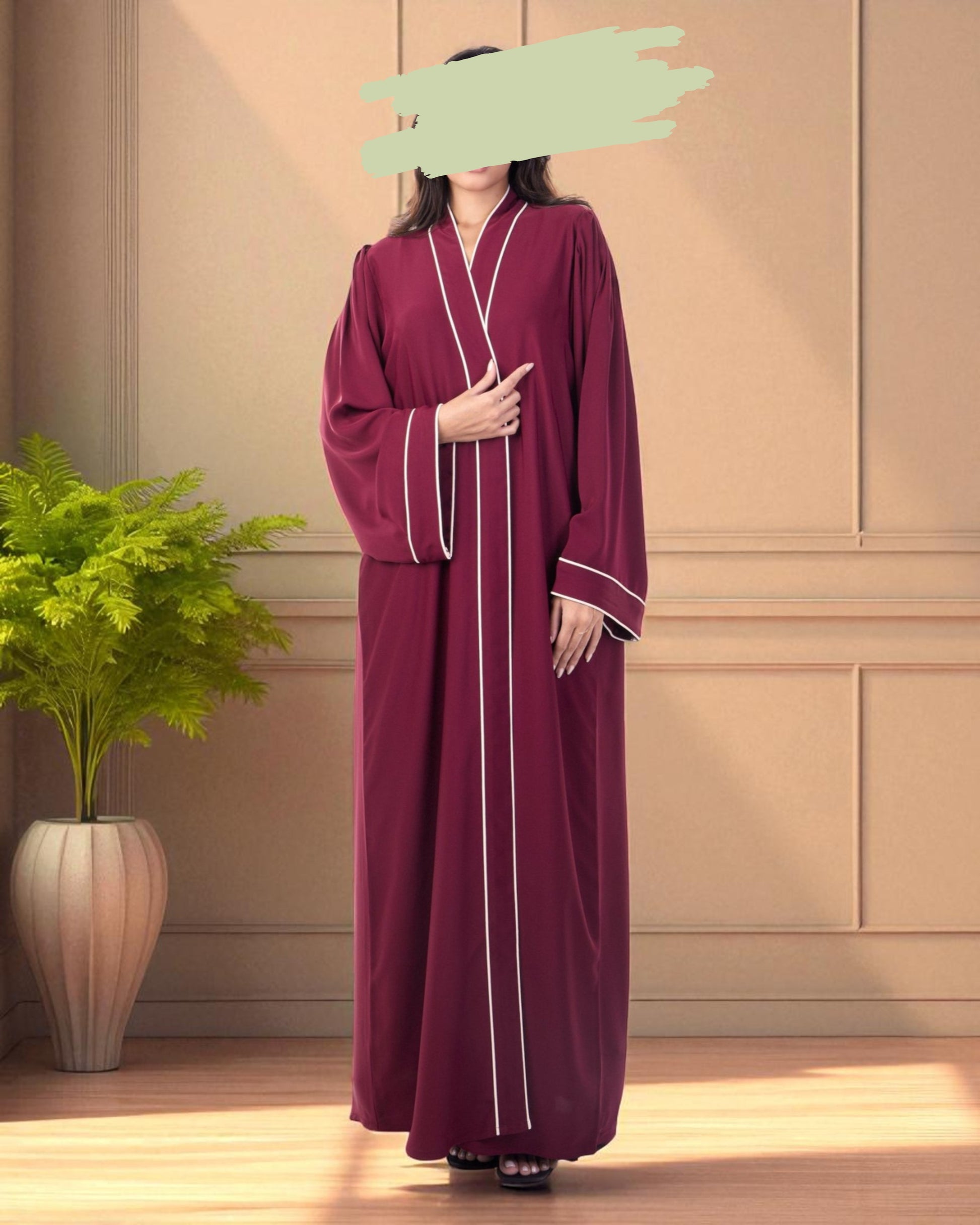 This front open maroon abaya in breathable Firdaus fabric features elegant white piping along the panel and sleeves, adding a touch of refined detail. Designed for everyday comfort, it comes with snap-on buttons, side pockets, and a flattering V-neckline. Wide sleeves offer ease for wudu (ablution), making this abaya both stylish and functional for modern modest wear.