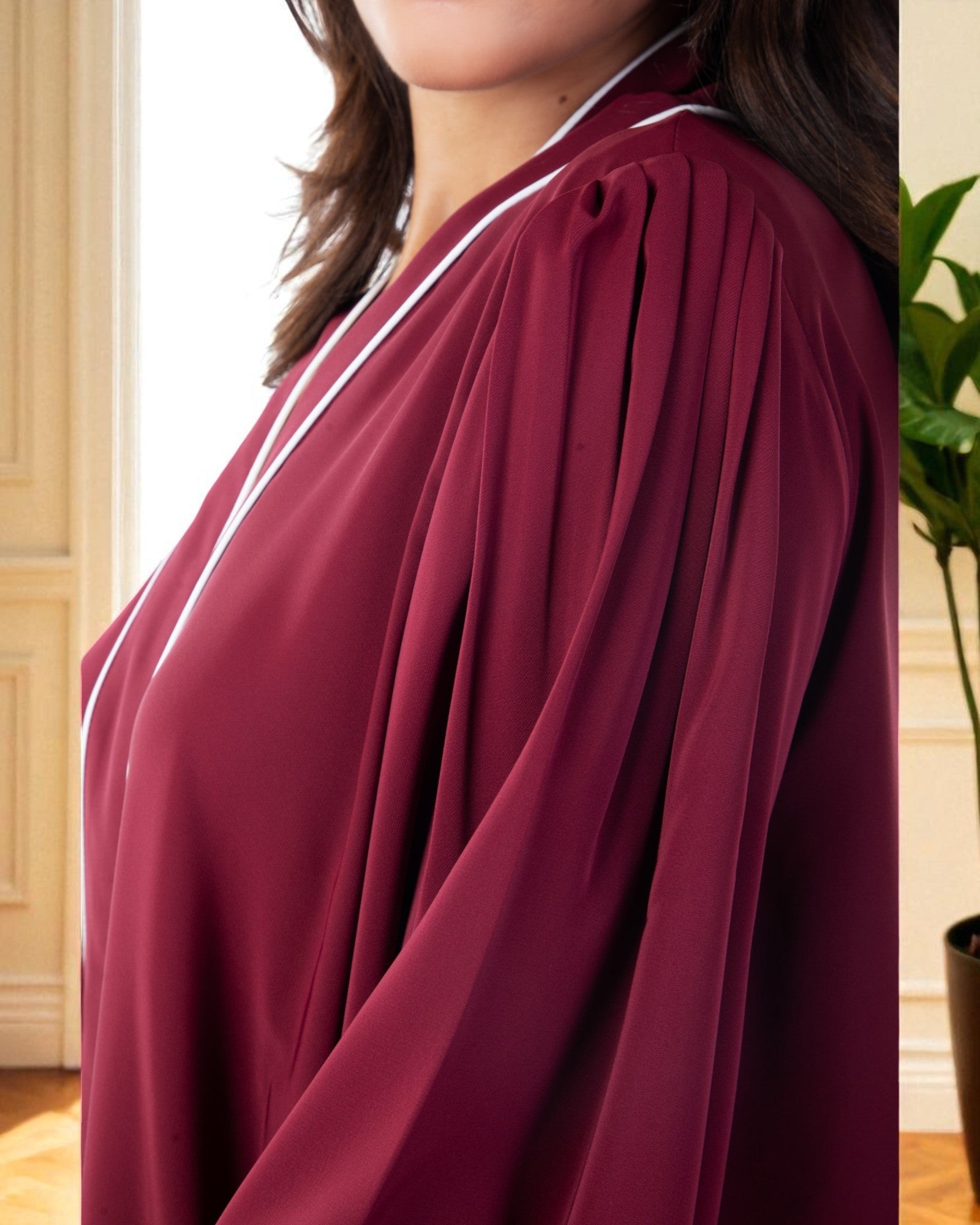 Front Open Maroon Abaya in Firdaus Fabric with White Piping, Snap Buttons, Wide Sleeves & V-Neck