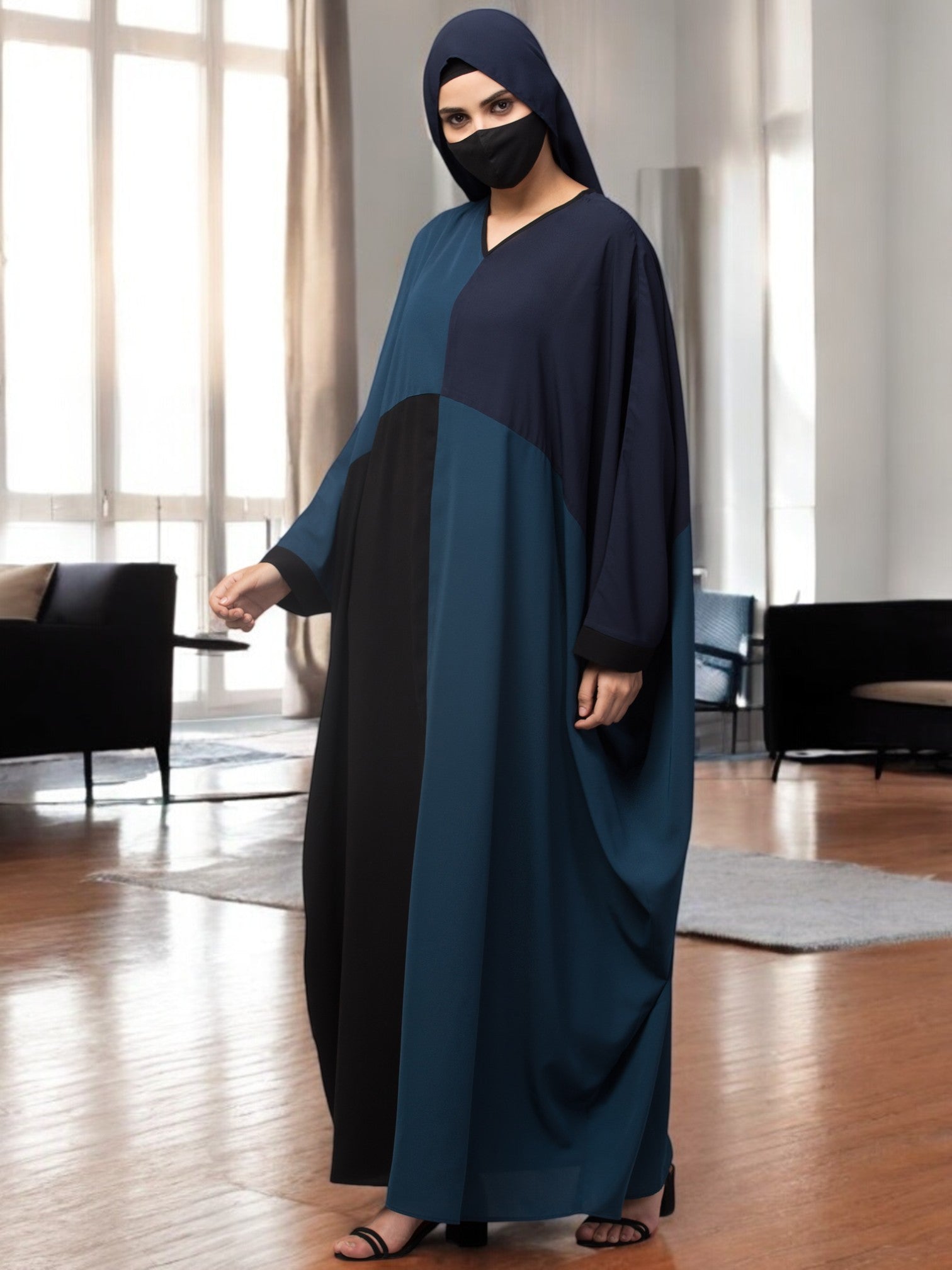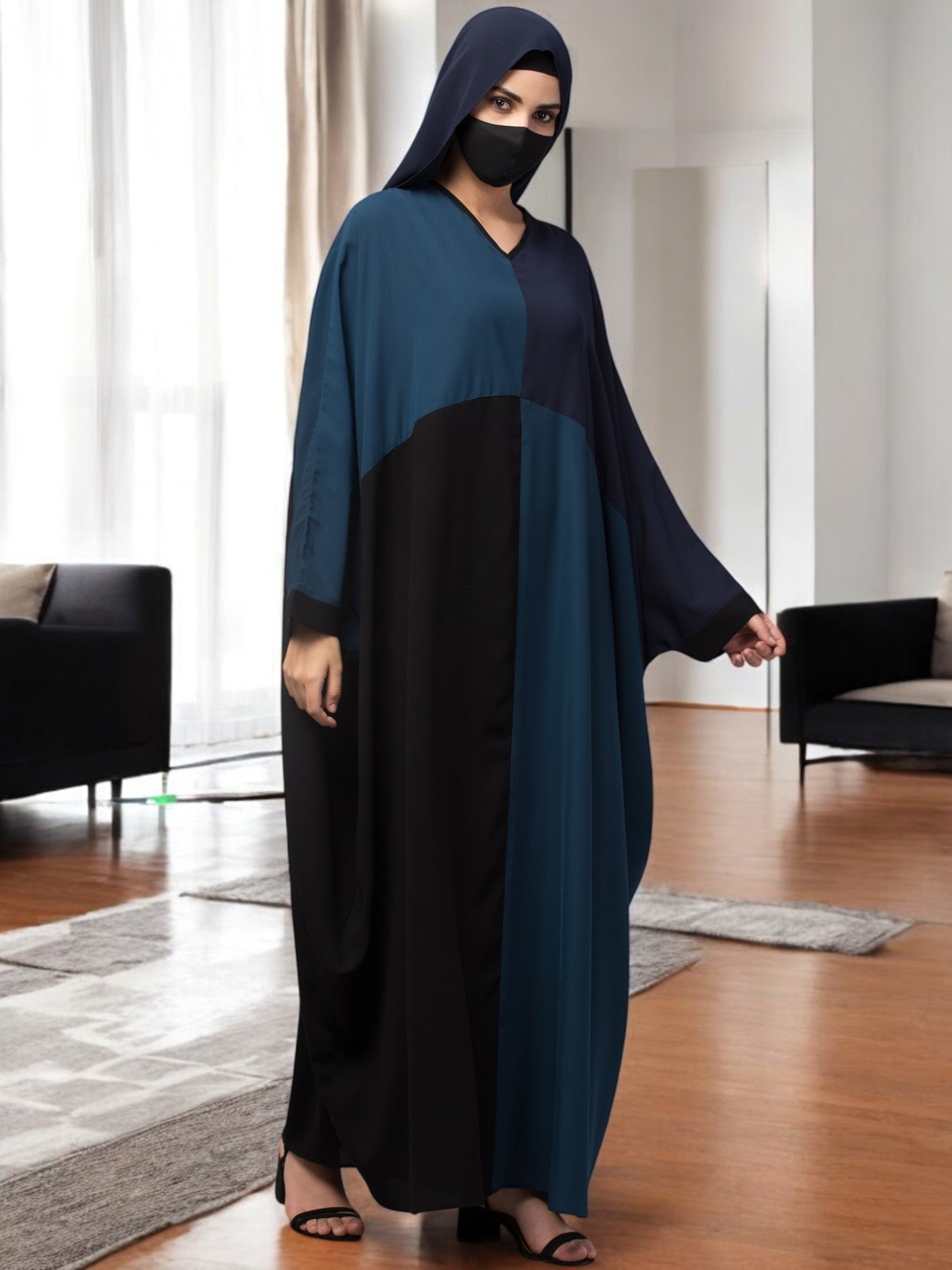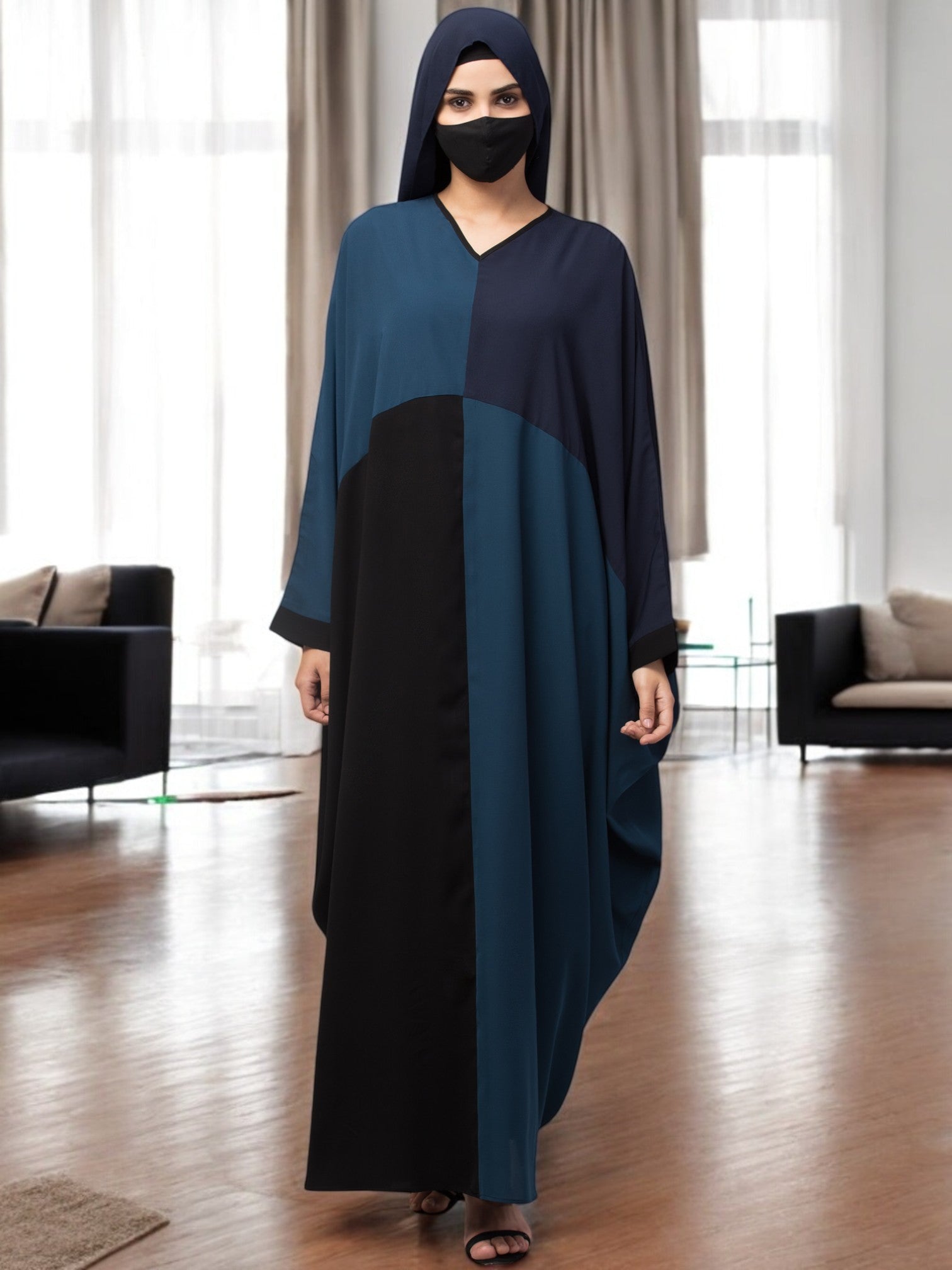 A multi-colored kaftan abaya in three tiers. colorblock squares in Blue, Dark Teal, and Black highlight the style.