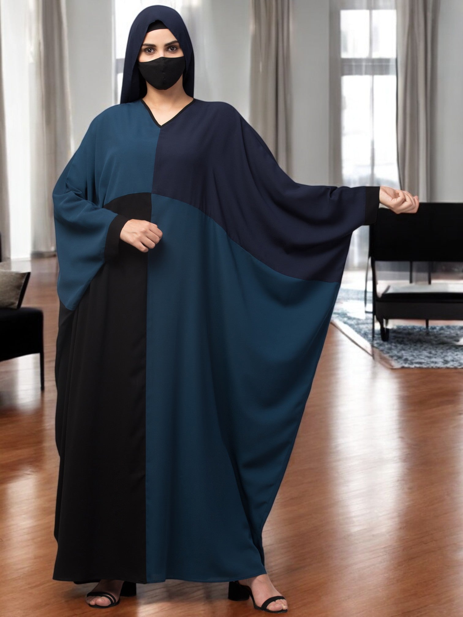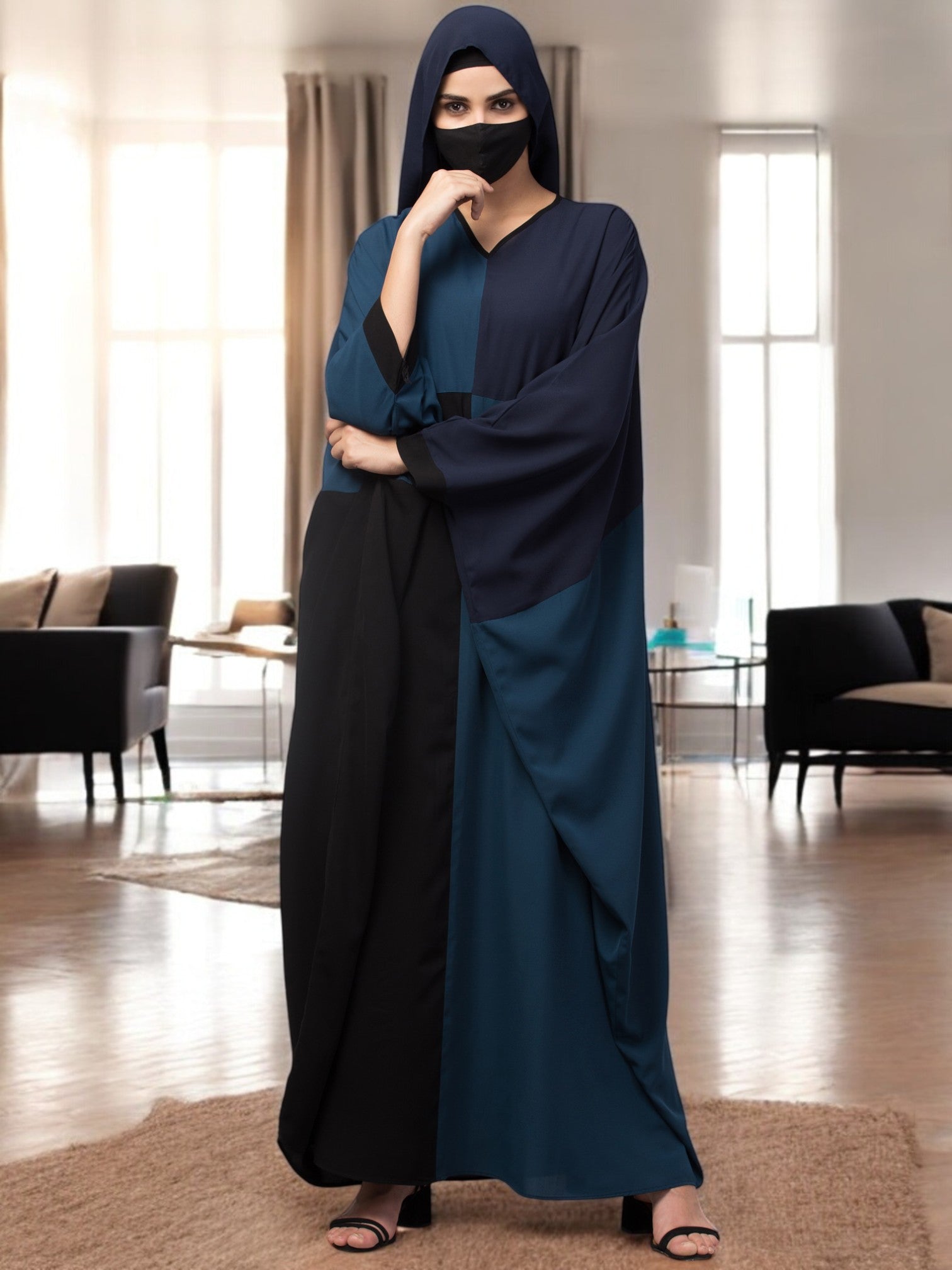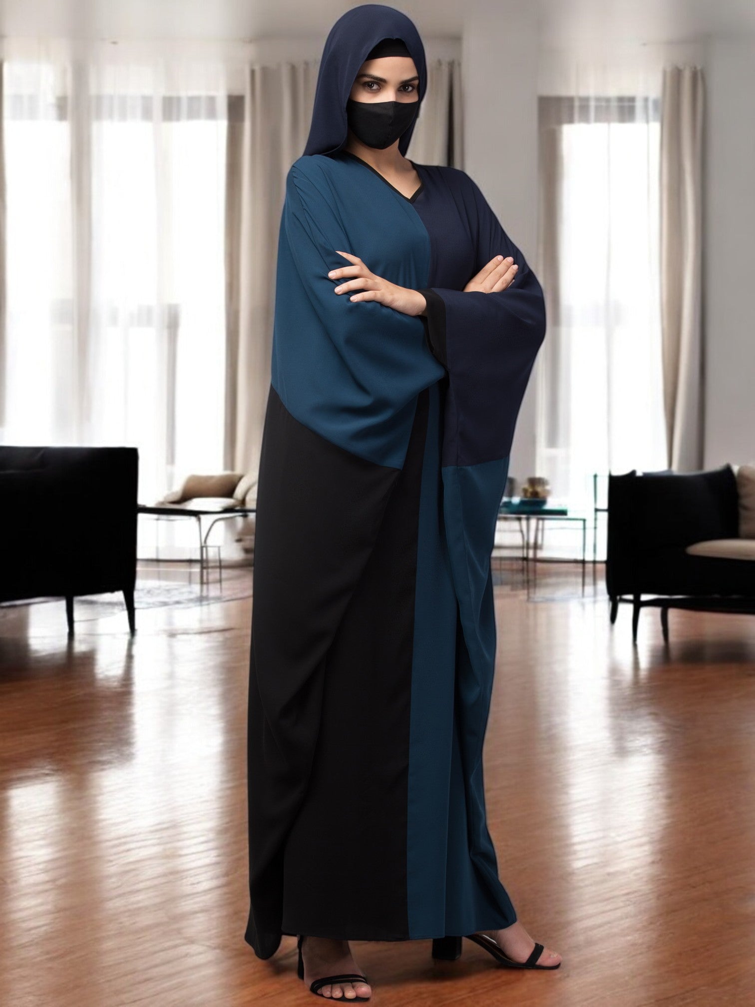 A multi-colored kaftan abaya in three tiers. colorblock squares in Blue, Dark Teal, and Black highlight the style.