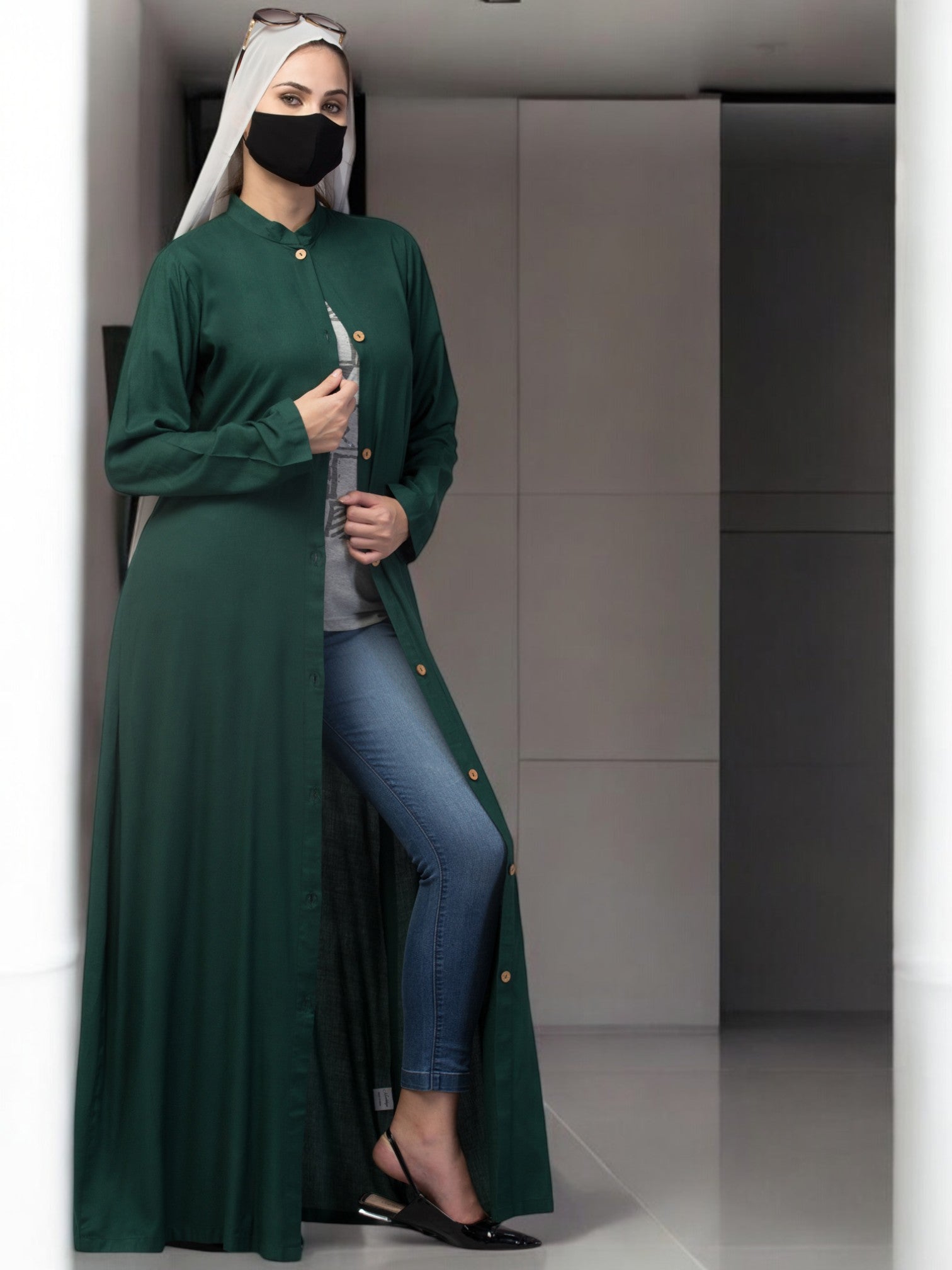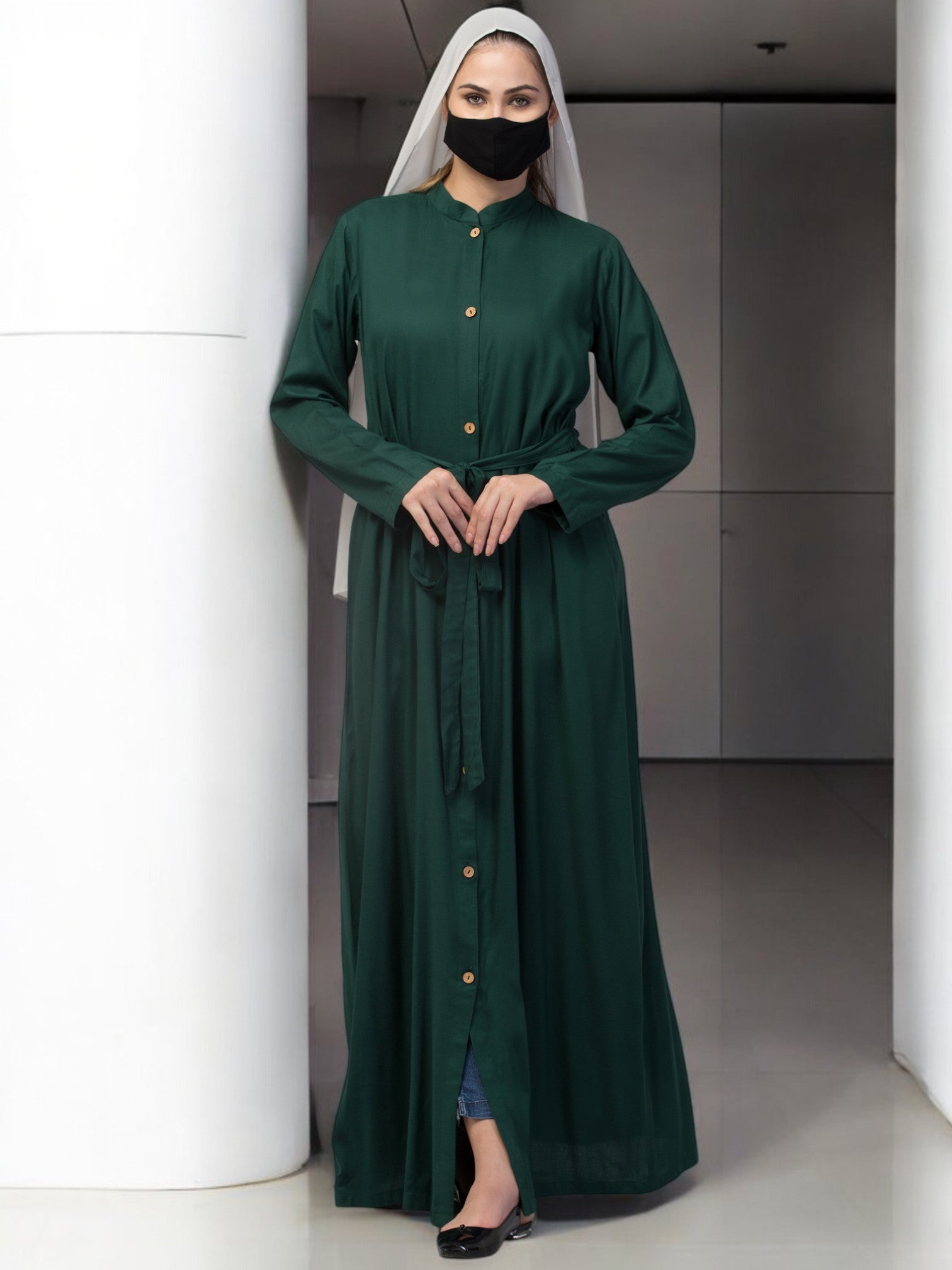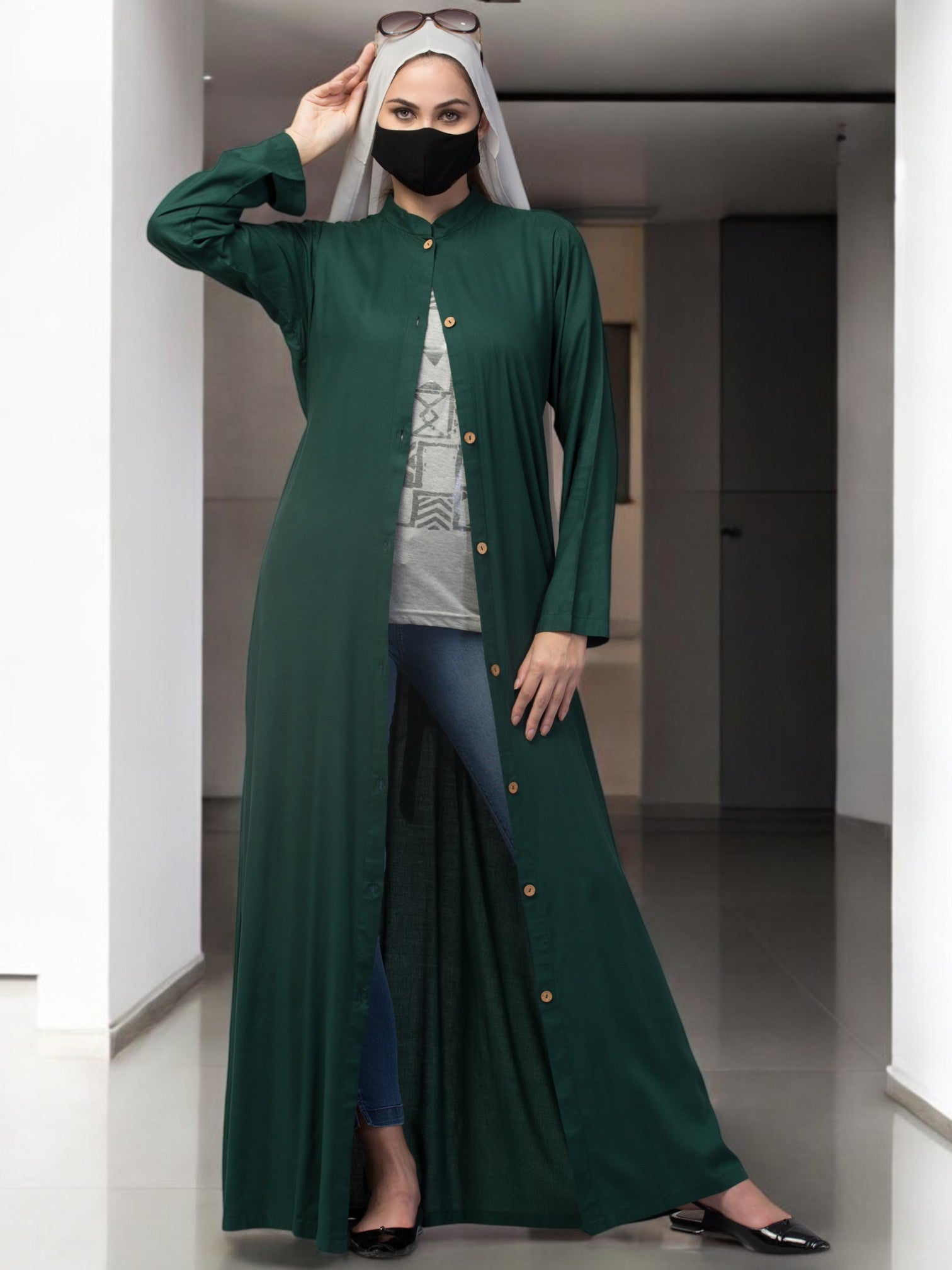 Front Open Abaya In soft Rayon fabric with regular sleeves and wooden buttons.