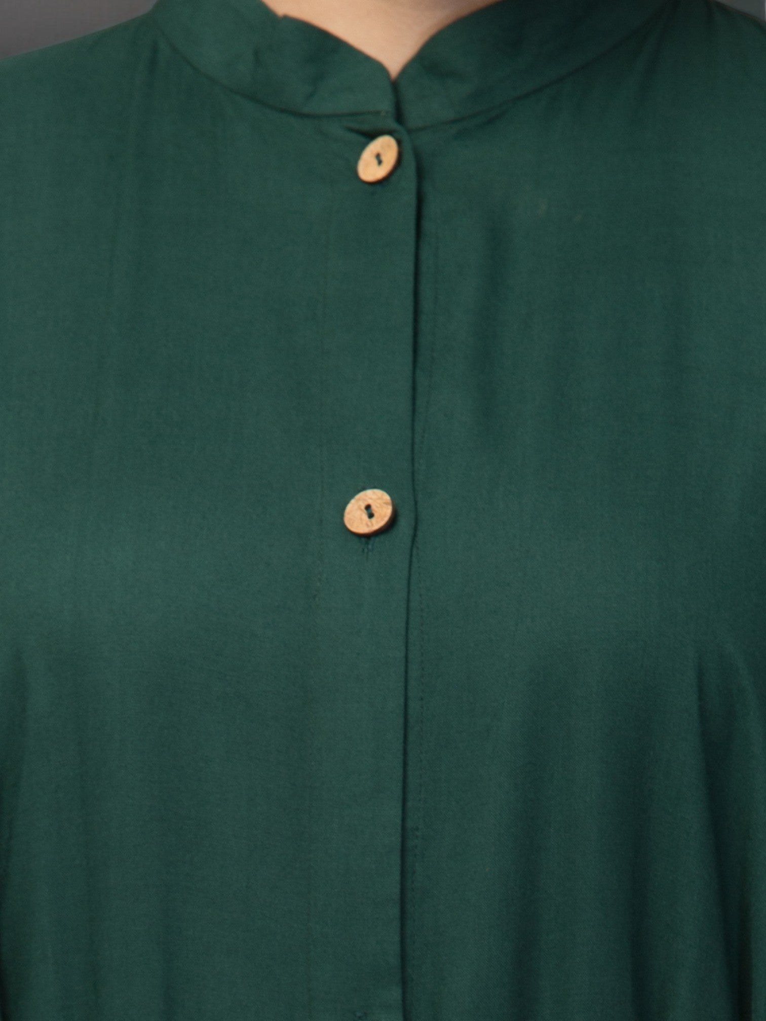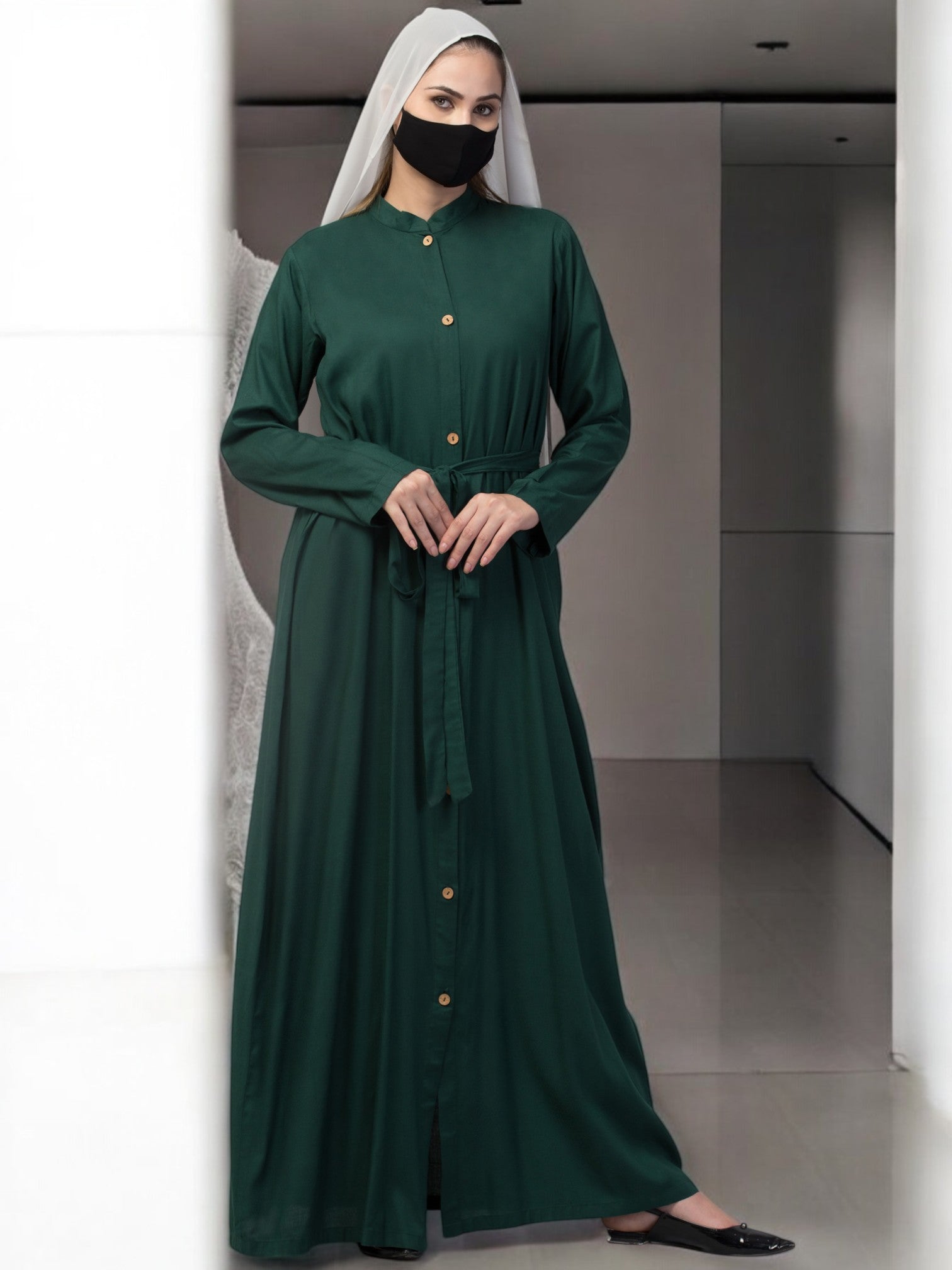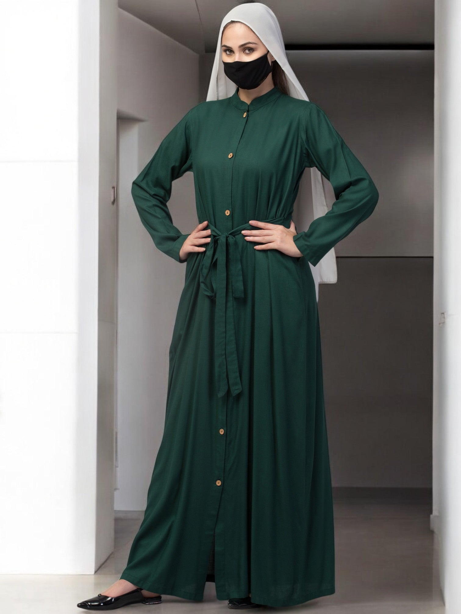 Front Open Abaya In soft Rayon fabric with regular sleeves and wooden buttons.