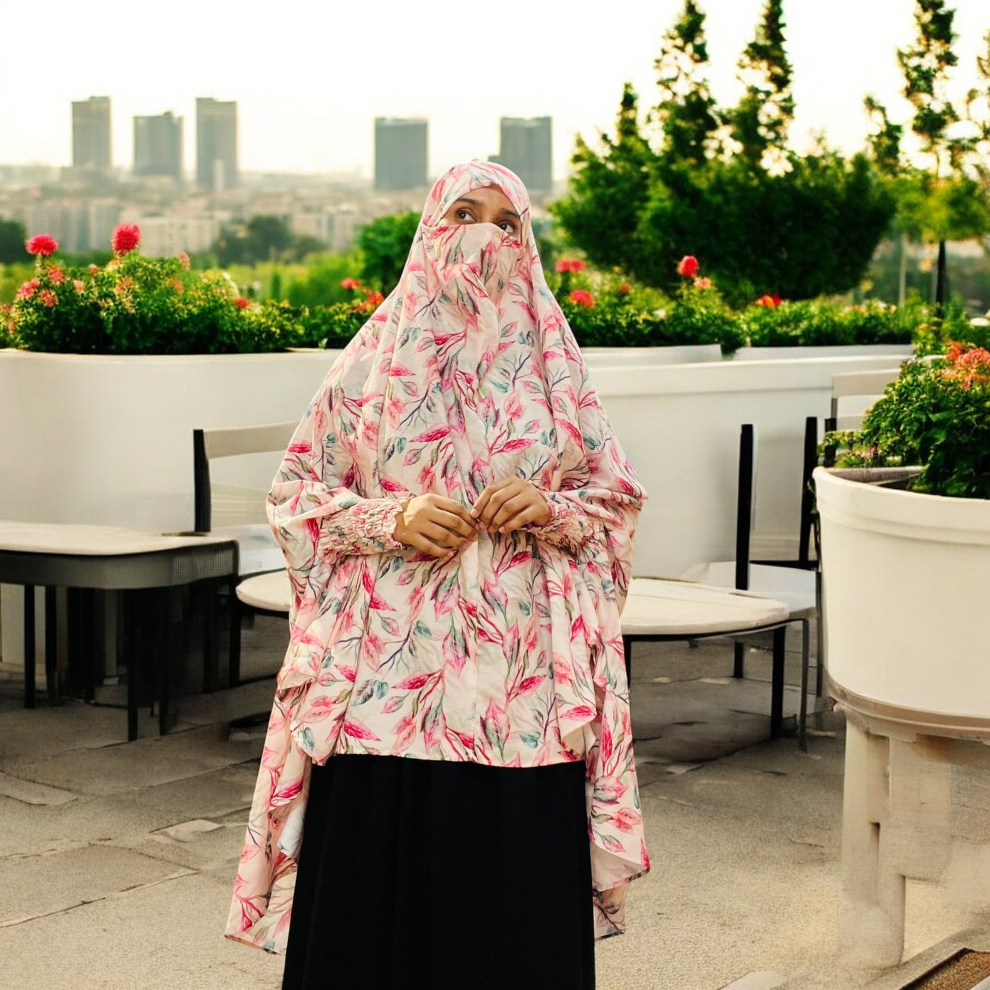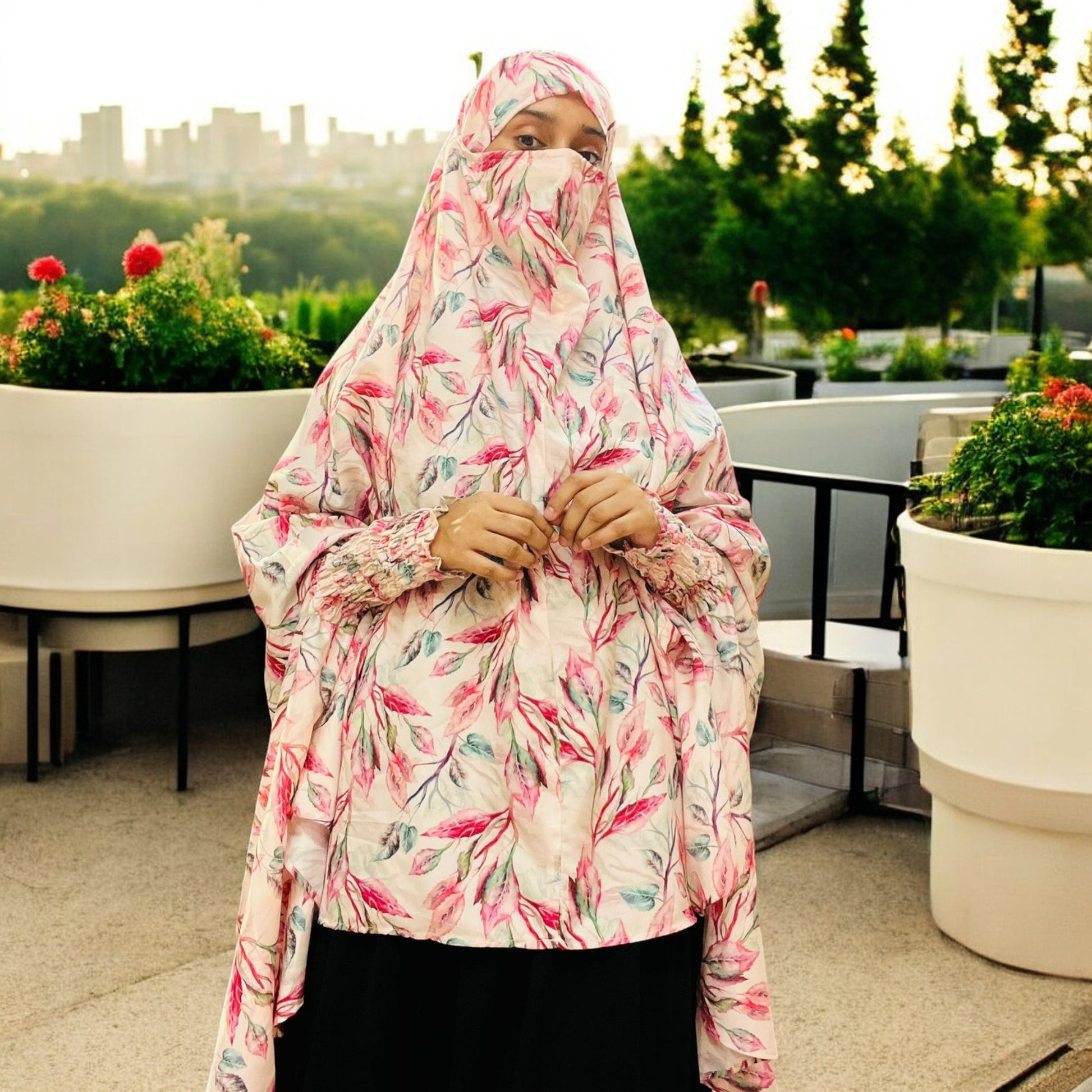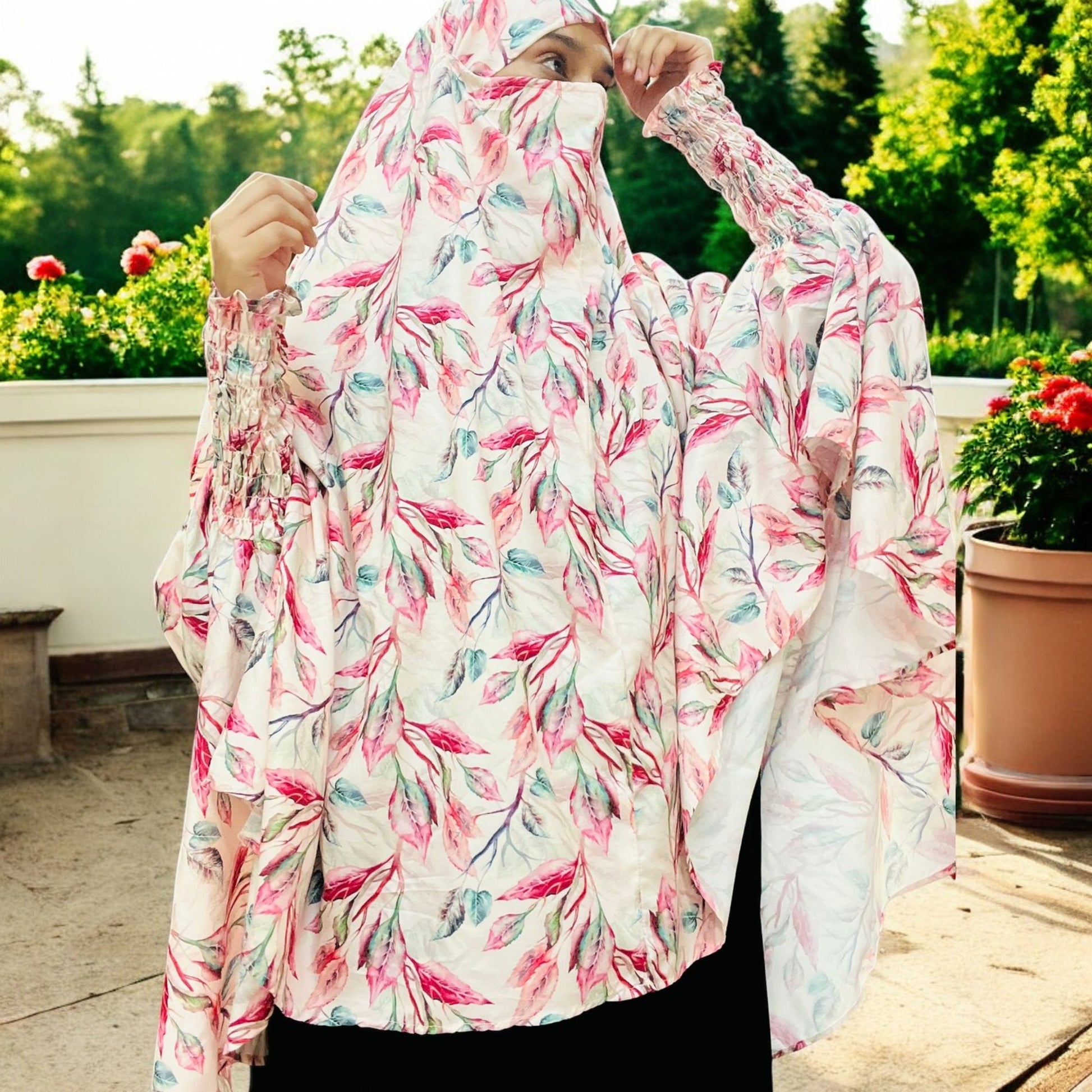 Printed Khimar-Long Prayer Hijab With Attached Mouth-Piece