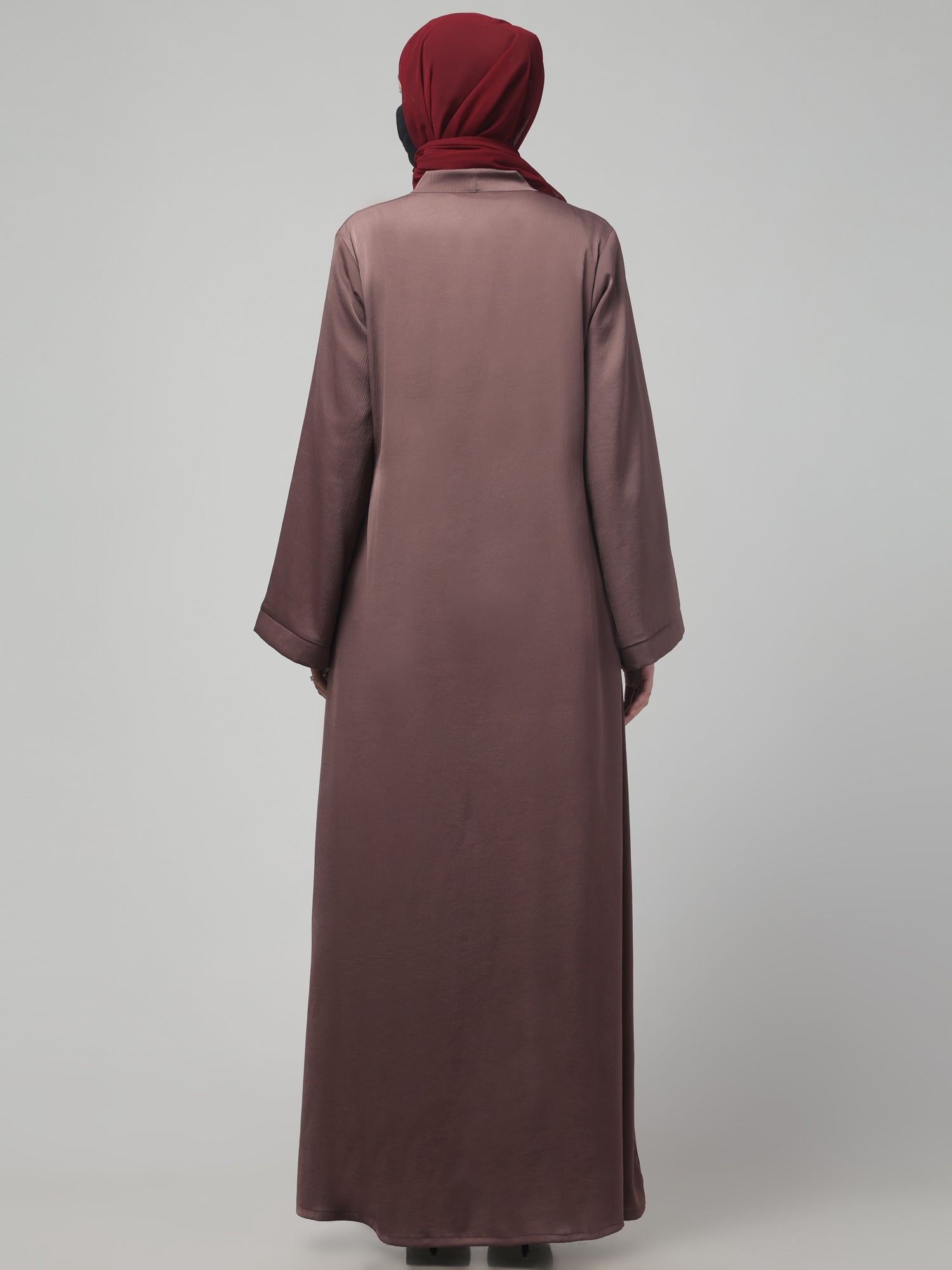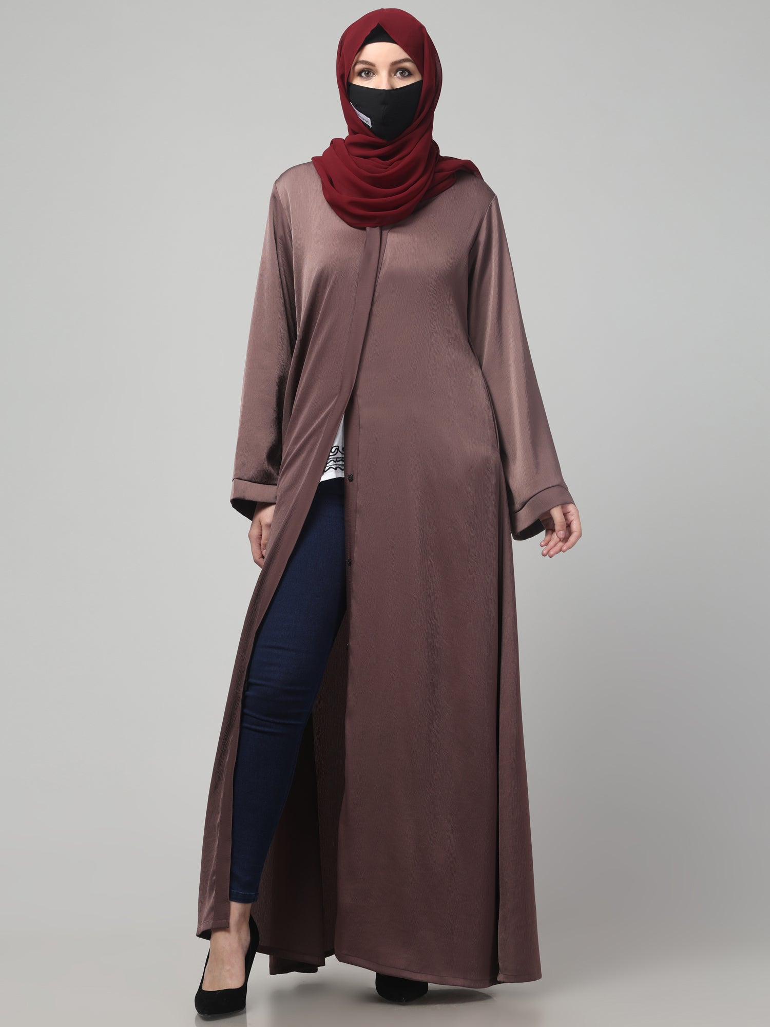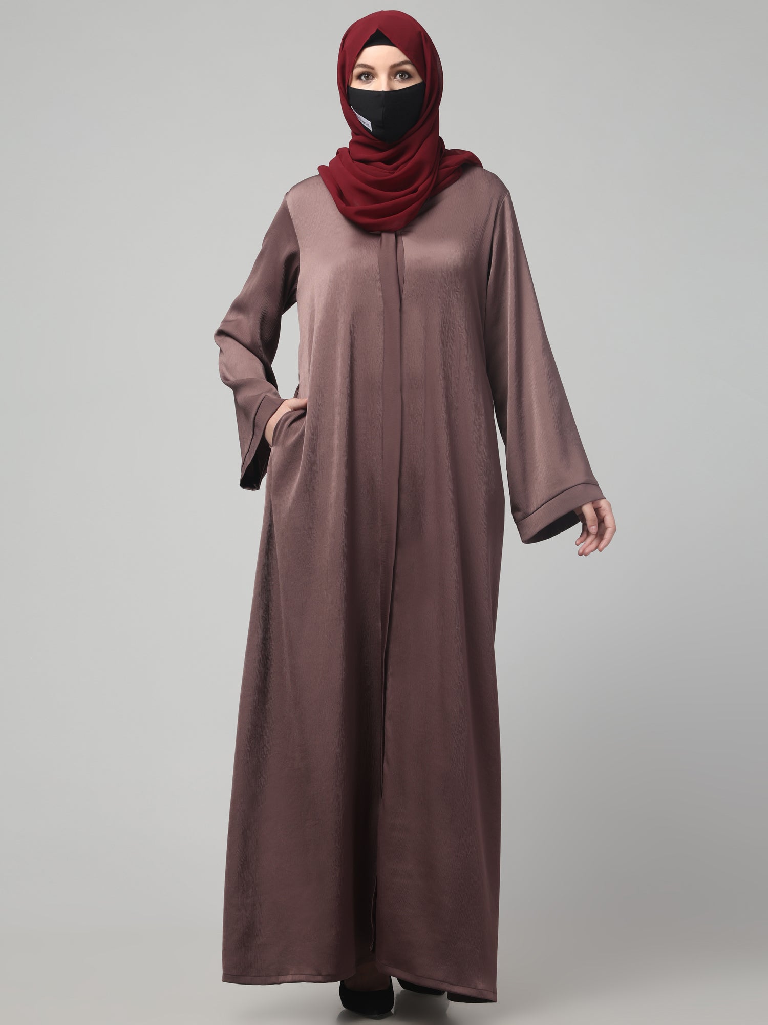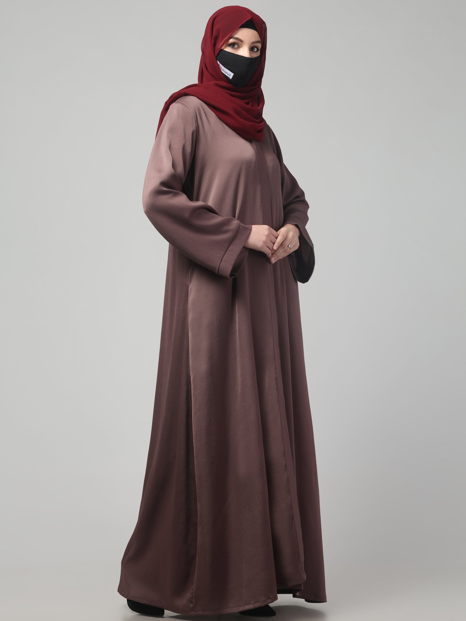 Elevate your modest wardrobe with this elegant front open abaya made from high-quality Tiktok fabric (polyester). Soft, silky, and featuring a subtle shine with a delicate crushed texture, this abaya offers both comfort and sophistication. Designed with a flattering V-neckline, secure snap-on buttons, practical side pockets, and gracefully flared sleeves, it ensures ease and style in every wear.
