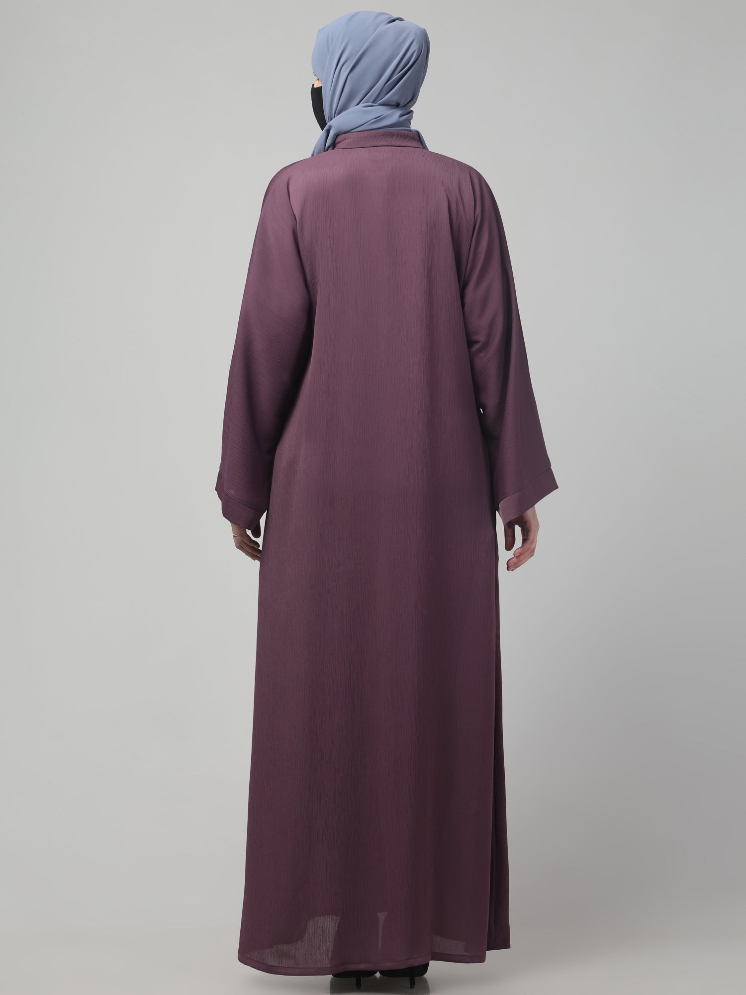 Elevate your wardrobe with this Front Open Abaya, crafted from Zoom Imported Fabric, a premium fabric with a minute crush effect that adds depth and sophistication. Designed for both comfort and style, this abaya embodies effortless grace: